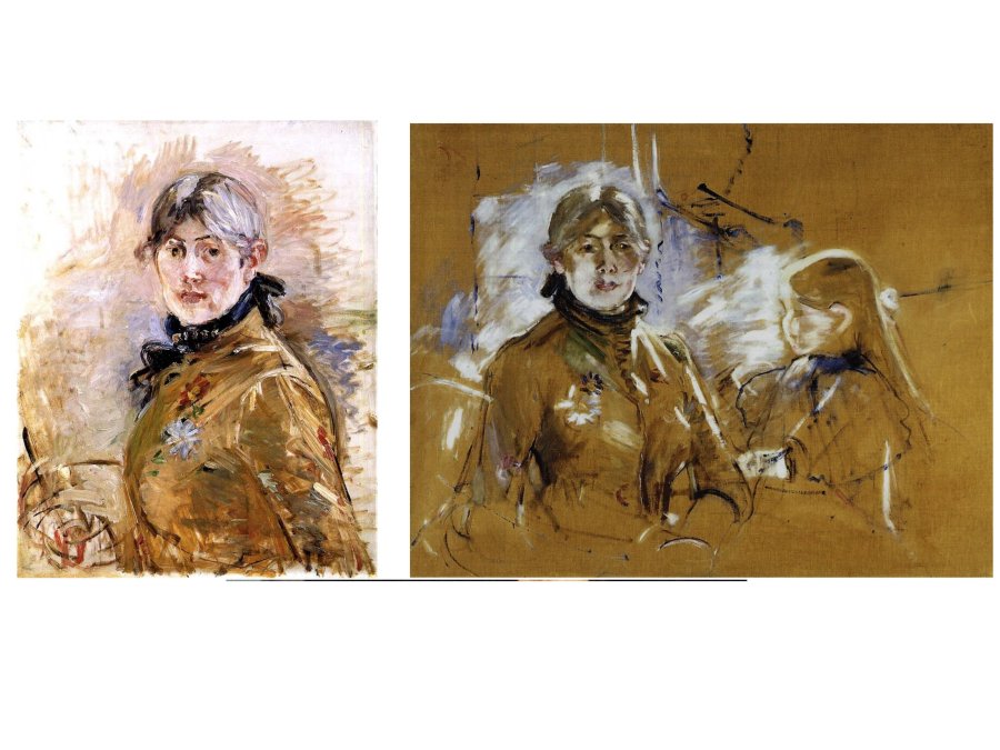 Morsiot dans ses auroportraits, reste proche du croquis/peint, cher à Degas par exemple. Vivacité, cotrastes forts, lumières, touche énergique. Modernité des coiffures et poses.