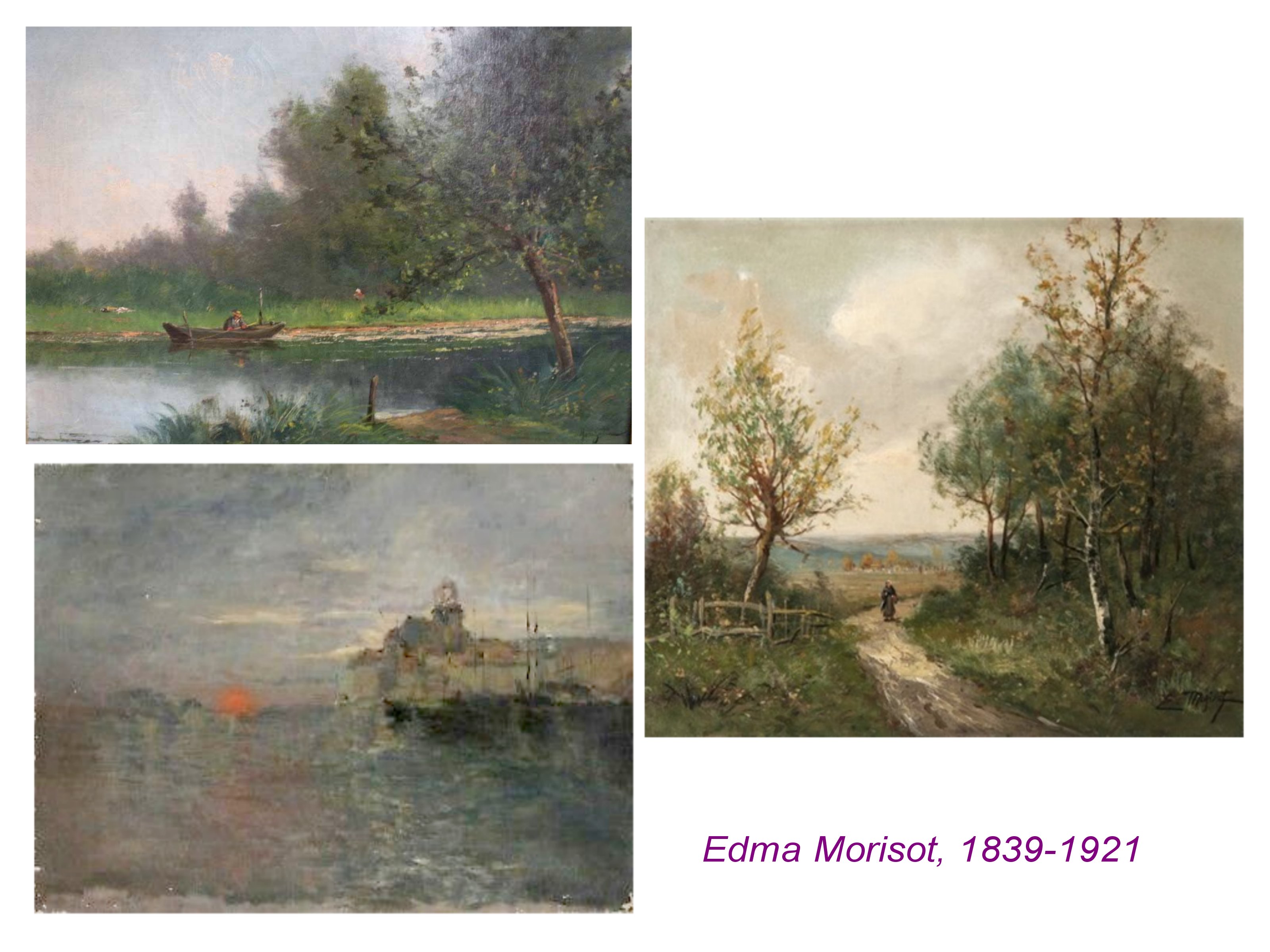 Bonsoir, si vous faites une recherche par images, en utilisant les termes : Edma Morisot oeuvres, vous avez accès à usieurs sites, mais le corpus complet de son oeuvre est inaccessible , tout comme celui de Eva Gonzales et Marie Bracquemond- Quivoron..affaires à suivre de près.