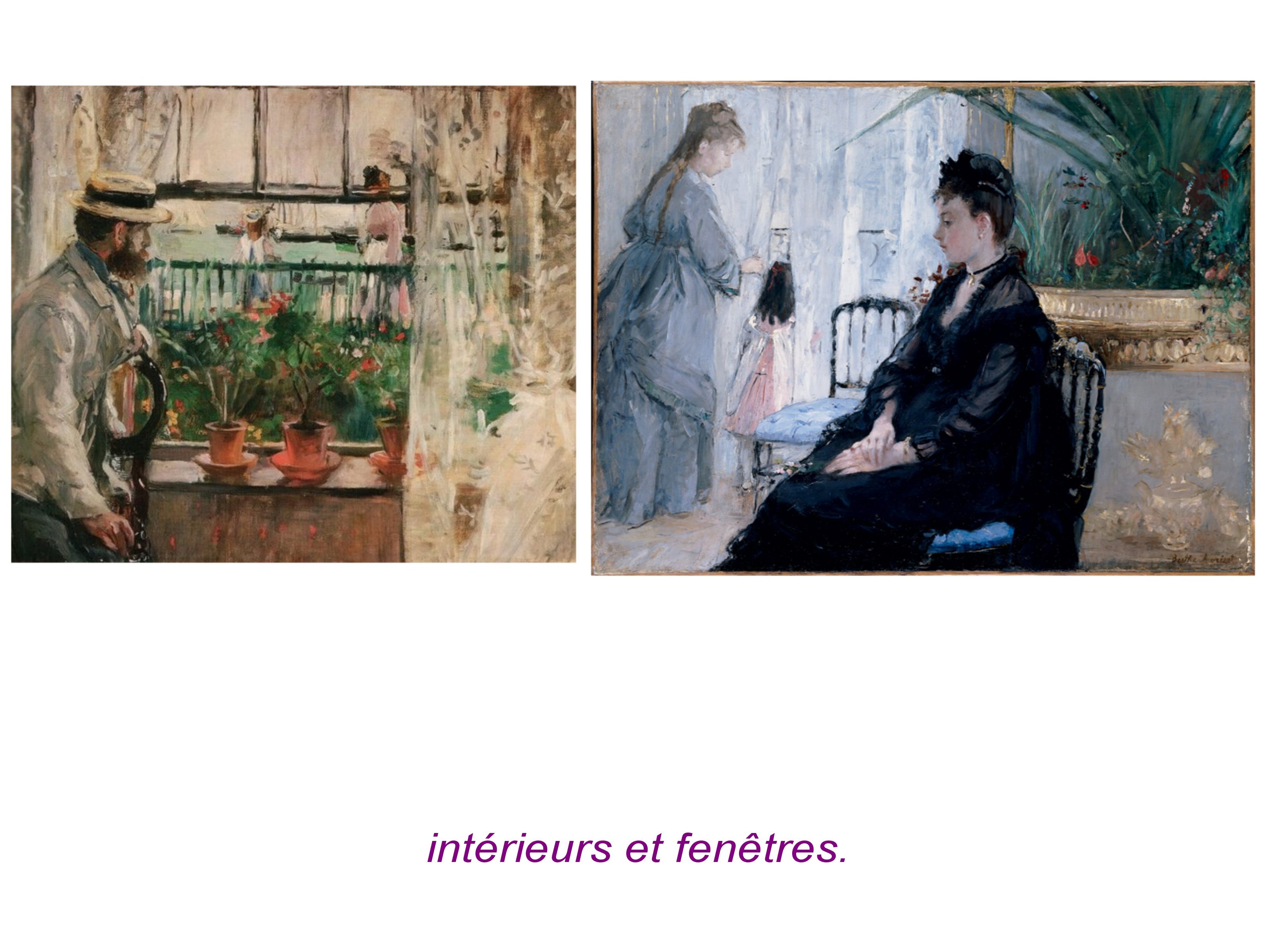 Le paradime de la fenêtre est ici clairement exporé. Avec le rideau, la fenêtre devient ouverture et surface, lumière et écran. Ici elle dialogue avec l’opacité du mur dans une déclinaison de rectangles rappelant le format de la toile. Autant de manière d’arrêter le regard. Doaloguie aussi avec les noirs.