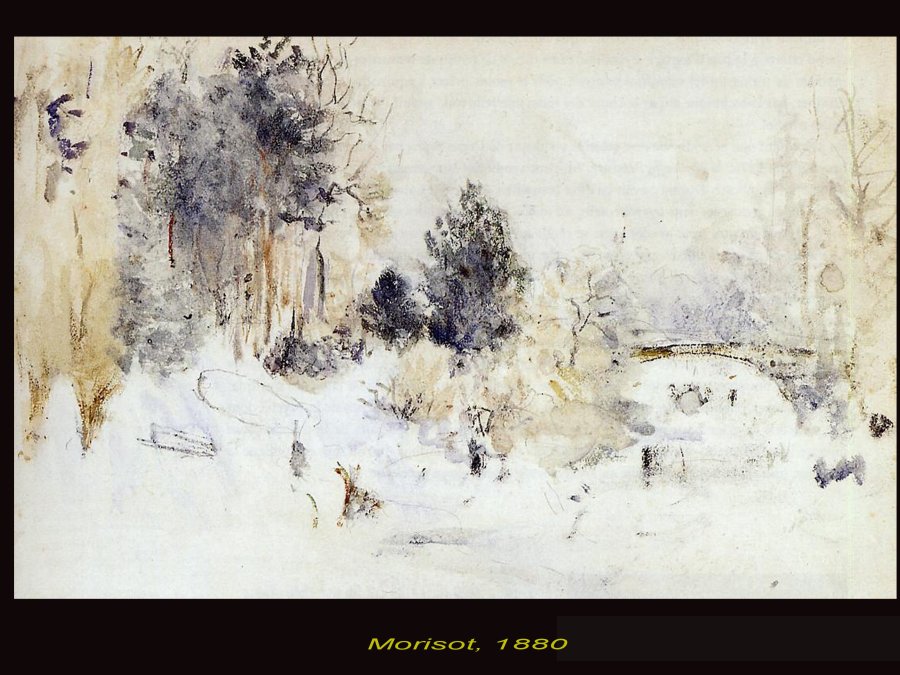 Le sujet de la surface neigeuse devient comme un morceau de bravoure pour les impressionistes. Berthe Morisot en fait une version d’une grande subtilité. Distilant de petits signes prégnants et légèrement colorés sur une neige qui semble poudreuse. Plus que jamais, cet exercice, demande une grande capacité à la légèreté et la précision des interventions. ici encore, il est question de surface de lumière. la page blanche.