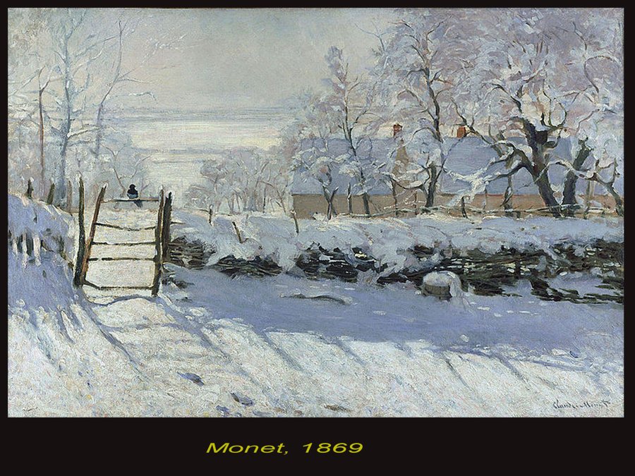 La saissante pie sur la barrière de Monet révèle son art absolu des délicatesses de tons et la franchise directe de son geste. Ici la neuge épaisse répond au ciel laiteux et glacé. Composition frontale et ponctuation de noirs .