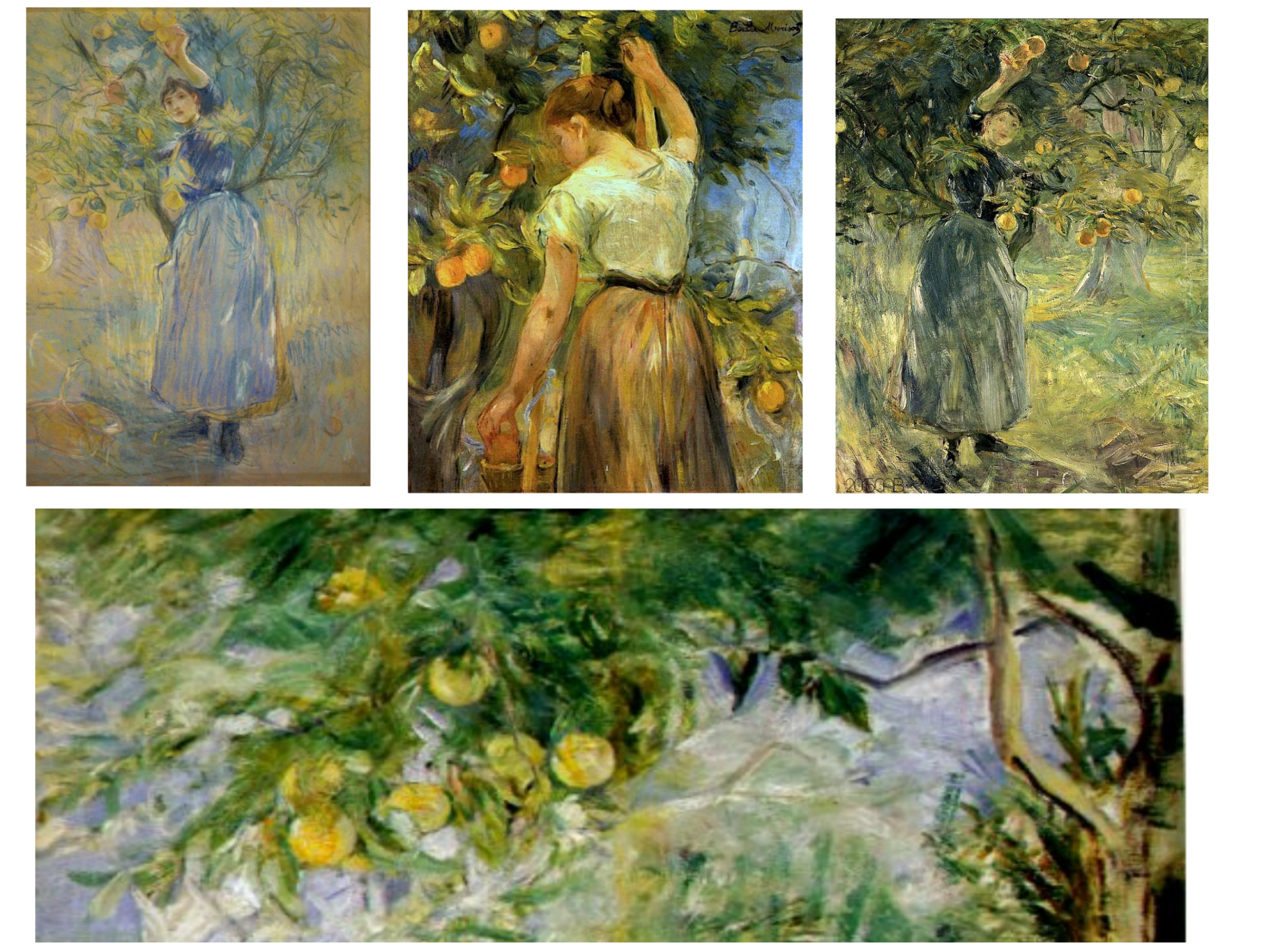 autre scène qui revient assez spuvent chez Berthe Morisot, celle de la cueillette. Contre-plongée et fragilité. De nouveau la question du sol qui se dérobe est suggérée, au bénéfice de la fusion dnas les couleurs et les taches/touches de couleurs.