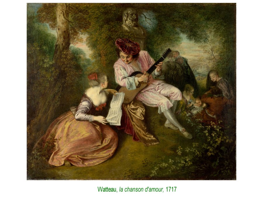 La chanson d’amour est une scène de genre charmante d’apparence, couleurs tendres et délicates, drapés vifs ; froissements d’étoffes, carnations délicates et nacrées. Le paysage est indéfini, comme un lieu sans finalité, ni parc, ni jardin, ni potager,ni campagne ; une sorte de métaphore de la nature végétale primaire et englobante. Le sol très inégal, permet une disposition déséquilibrée des personnages, le musicien derrière la chanteuse, se trouvant au dessus. En arrière plan, un couple semble s’écarter. Solitude et intimité, insouciance semble t-il.