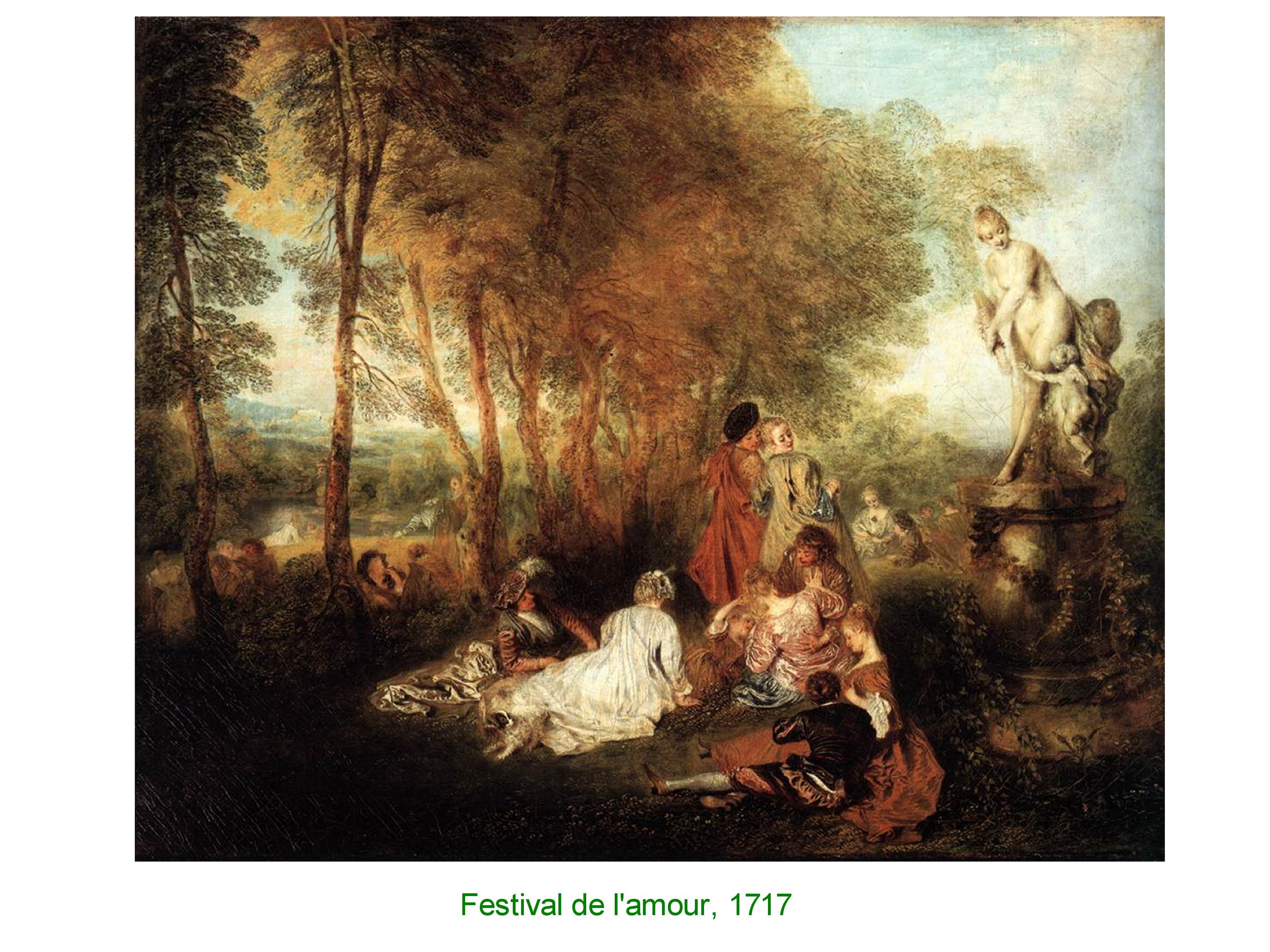 Le festival d’amour, procède du même dispositif scénique ; les décors sont des ramures floues et enrobantes, les sols inégaux et les lointains confus. Ni architectures, ni perpsetive. Insouciance des groupes, ici montrés de loin, avec un certain recul. Sorte de solitude dans une lumière tout de même déclinante. La touche de Watteau est extrèmement variée ; tantôt commebrossée et loue, ailleurs d’une netteté et d’une précision minitieuse, évoquant la brillance des étoffes, satins, soies.