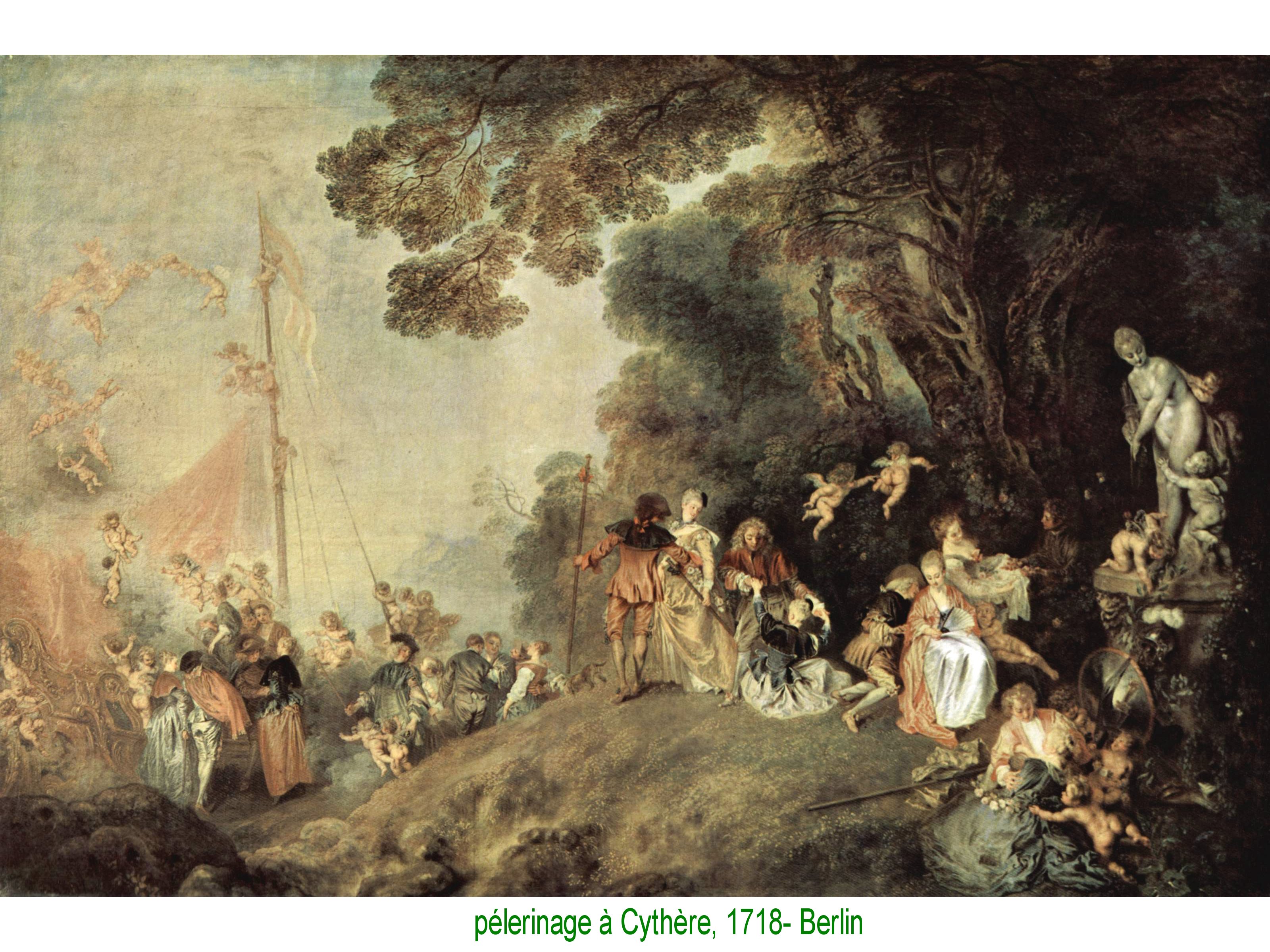 Dans cette version de Berlin, quelques éléments ont changé, notamment le coupleà droite du centre, un homme debout, relevantune femme assise. Dans ces deux versions, l’inégalité du sol justifie les postures chancelantes et incertaines. Quant à la destination, elle est délibérément un fantasme.
