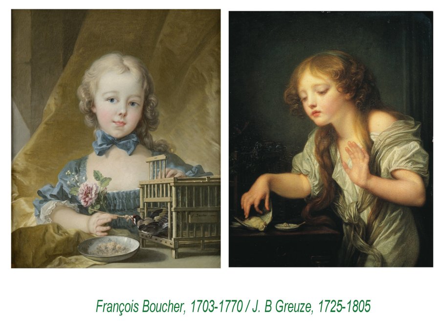 De même, ces scènes apparamment très innocentes, voire mièvres, de Boucher, comme de Greuze…….cachent des métaphores qui nous apparaissent effroyables et significative des abus de pouvoir de l’épaoque ( pas si éloignée)..L’oiseau en cage est une allégorie de la virginité..