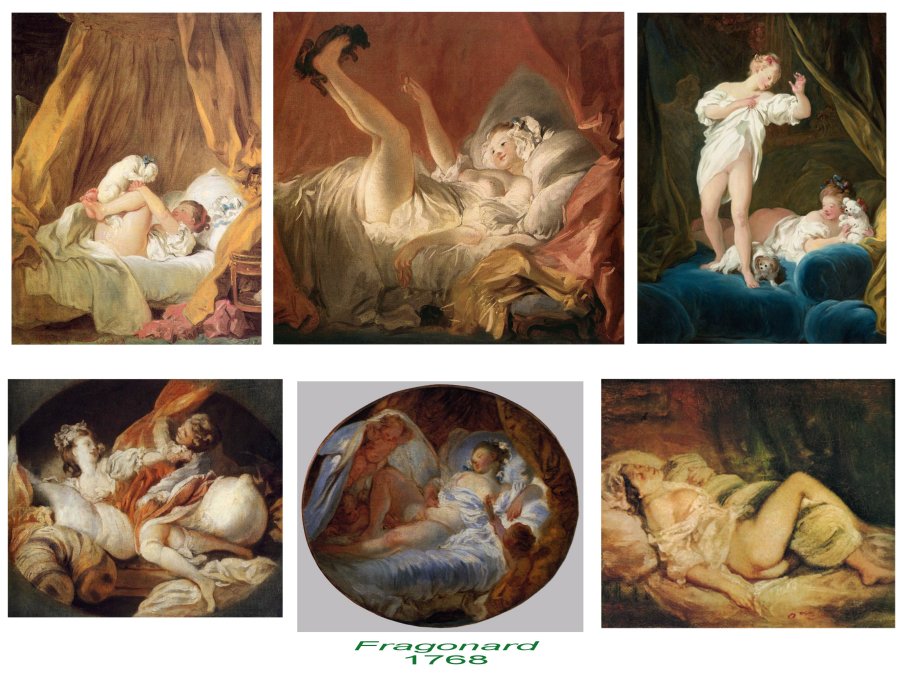 Il est intéressant encore de comparer l’érotisme peint par Fragonard de celui peint par Boucher et Greuze ; les scènes très explicites également, sont ici des scènes intimes, où de jeunes femmes ne sont pas les proies d’abuseurs et expriment clairement de la joie et de la complicité.