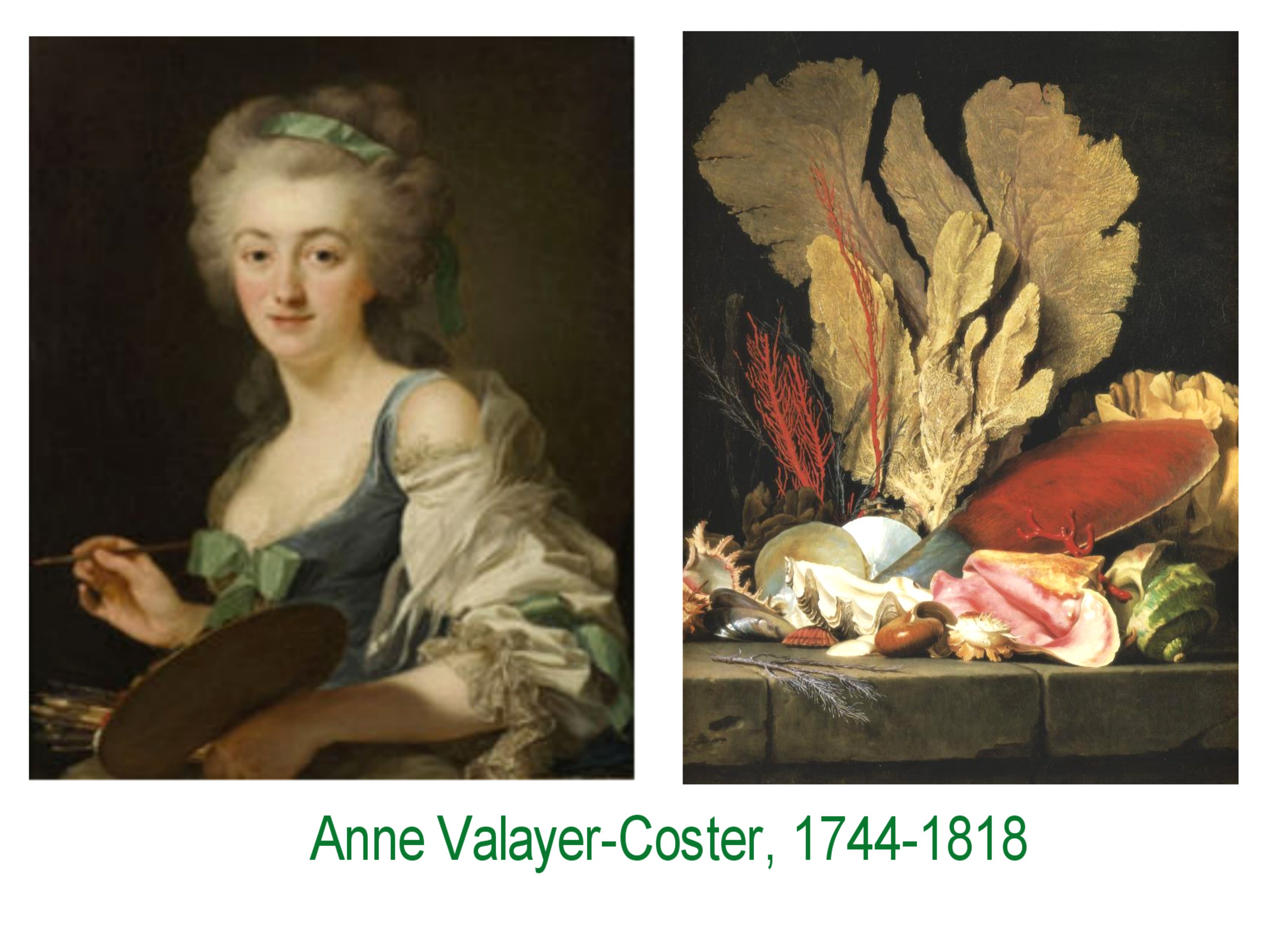 Anne Valayer Coster, dans cet extraordinaire nature morte, fait émerger au sens strict, ces formes vivantes, jusqu’à présent englouties, des coraux et coquillages marins, sans écarter les allusions sexuelles de ces tons nacrés.