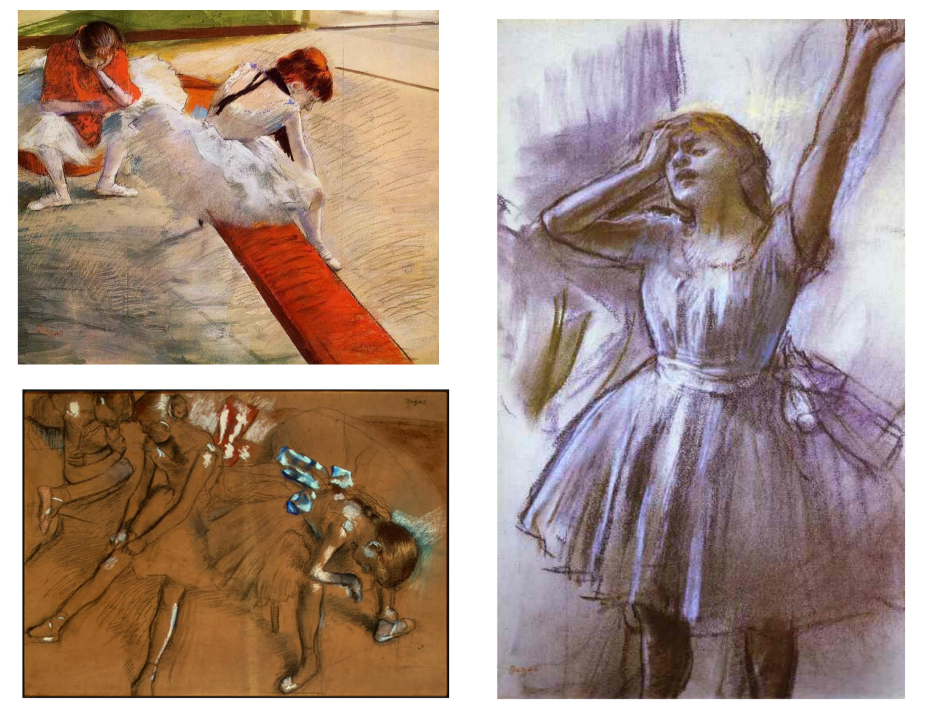 Il y aune belle cohérence pour Degas, à esquisser ces danseuses, dans des postures naturelles. Instants brefs de corps se détendant et/ou se préparant au spectacle majeur de la dans de ballet. Nous sommes ici dans des coulisses. c’est un regard de biais. Ces positions sont naturelles et éloignées de toutes les affectations académiques. Le fait de travailler sur l’inachevé est justifié par l’idée que le modèle ne pose pas. Il s’agit de la saisie d’un instant. Degas privilégie ostensiblement le décalage et le cadrage décentré.