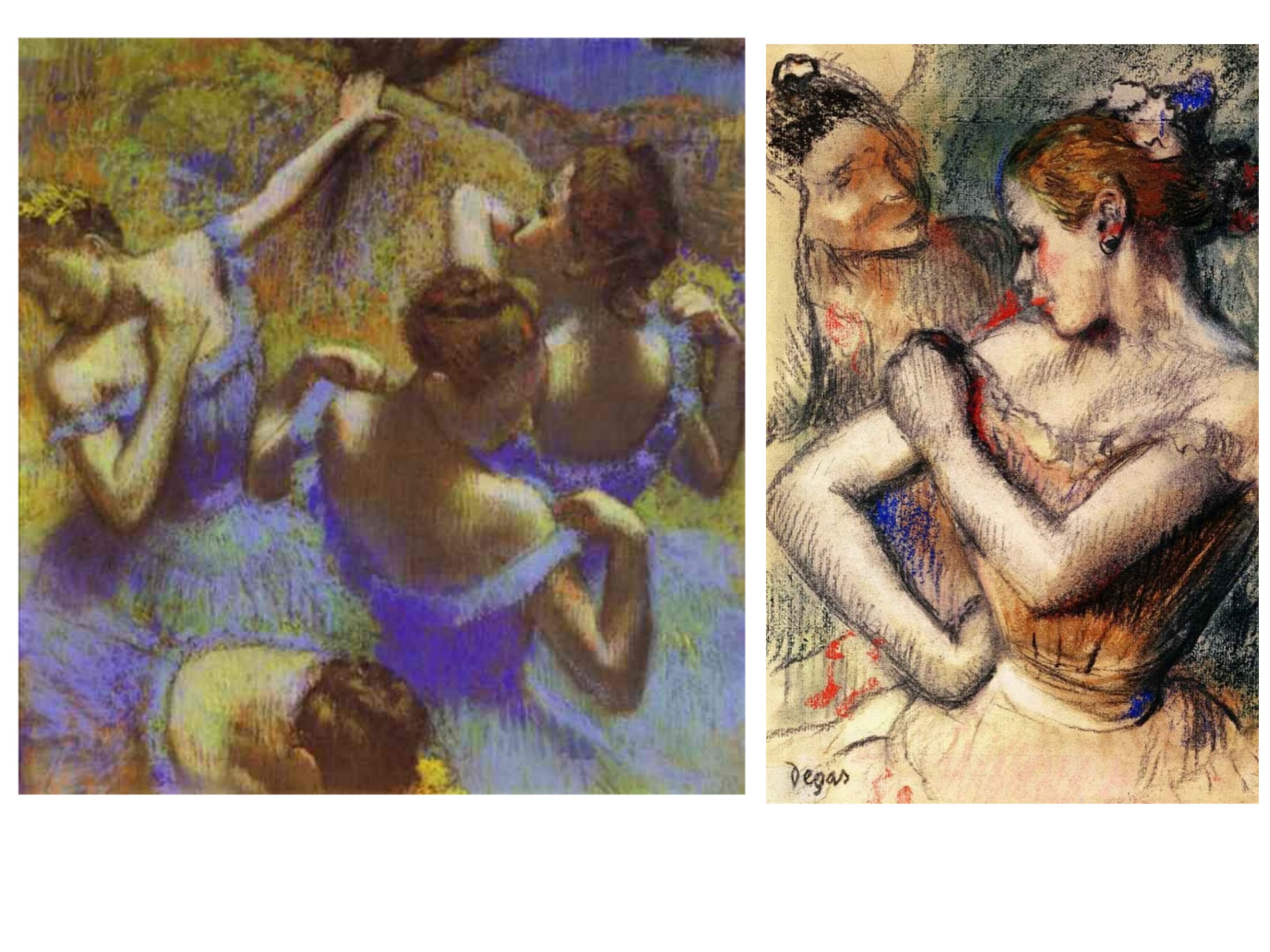 La recherche de points de vue décentrés, est justifiée par la nécessité de voir, sans être forcément vu, afin de repérer des attitudes naturelles. On remarque aussi comment il revient vers des structures constantes. Bras pliés et torsions. Il utilise souvent les « rehauts » de blanc pour faire saillir les modelés, dans la tradition de Watteau et des grands maîtres.