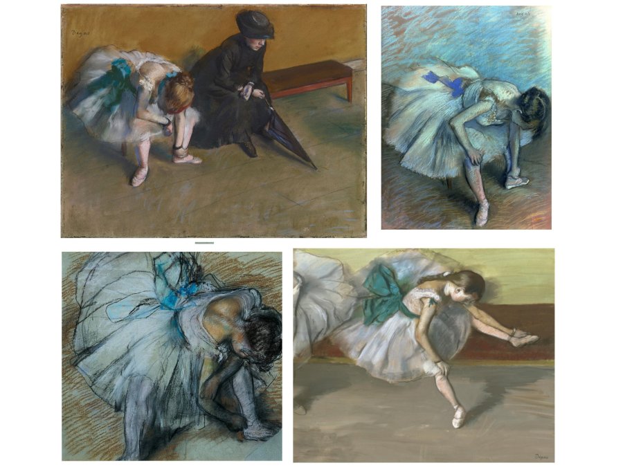 Le sujet n’est pas si anodin. Ici 2 solitudes exprimées, attentes diférentes. Ages, corps, costumes . Degas saisit aussi des moments de vie avec une grande sensibilité, en se faisant oublier. Le vêtemnt des danseuse est un sujet pictural spécifique,, le flou et cette corolle de lumière mérite un traitement particulier.