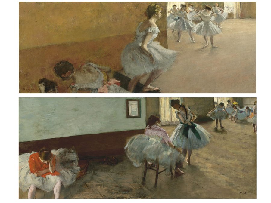 Cette circulation du regard est l’un des grands points forts de Degas. Du premier à l’arrière plan, mais encore du bas en haut. Le format allongé permet aussi, nous l’avons vu, de dégager de grandes zones, tels ces murs, ou ces planchers et sols, qui deviennent de pures surfaces picturales, traitées par nuances et traces. Degas ramène comme ceci, les espaces tridimensionnels ( murs et sols) à des surfaces planes, traitées comme telles. Mais parcourir une surface..c’est exactement ce que font les danseuses..