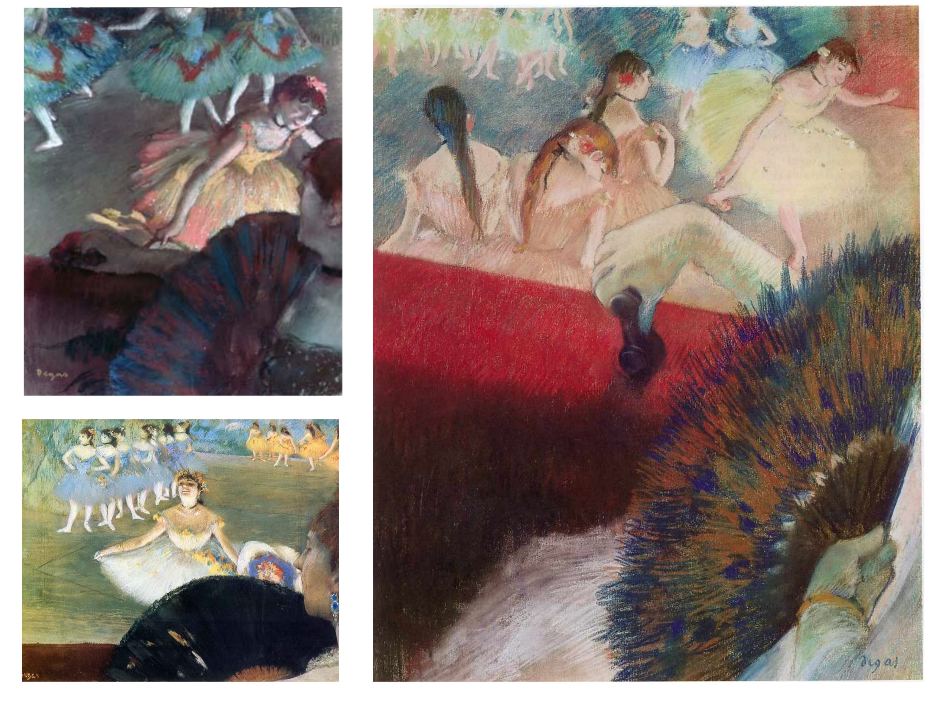 Ces trois versions d’une femme à l’éventail, tenant une paire de jumelles, réussisssent une synthèse parfaite des préoccupations de l’artiste. Point de vue décalé et plongeant, basculement du sol, ouverture de l’éventail et des membres des danseuses, oscillation du regard, passant du premier à l’arrière plan par des balancements.