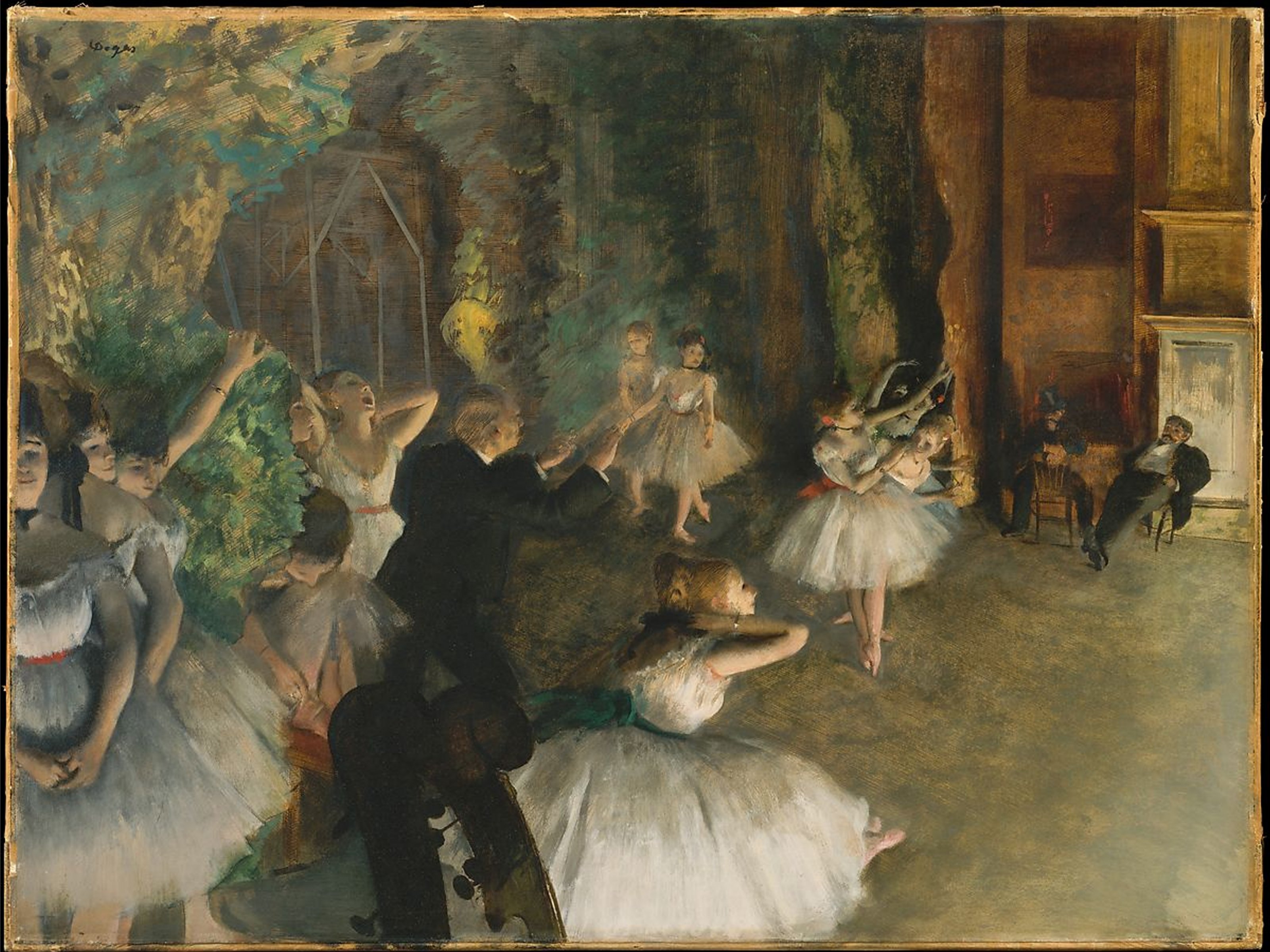 Degas passe des journées, des semaines et des mois à l’Opéra, fidle et habitué, il habite cet espace propice à tous les points de vue, tous les cadrages. Il contourne le spectacle officiel, la grande scène, pour privilégier les coulisses, les loges , les répétitions. Il voudrait ainsi s’approcher au plus près d’un art en train de se construire..peut être la première notion de « work in progress », qui est aussi consolidée par son propre travail de peintre, dont il dévoile les effets, coups de crayons, traces, frottements, gestes brouillons, pauses virtuoses, effets de lumières et de mise enscène…Remarquons dans cette oeuvre, la posture des danseuses, qui dorrespond à l’oeuvre initiale de cette galerie.