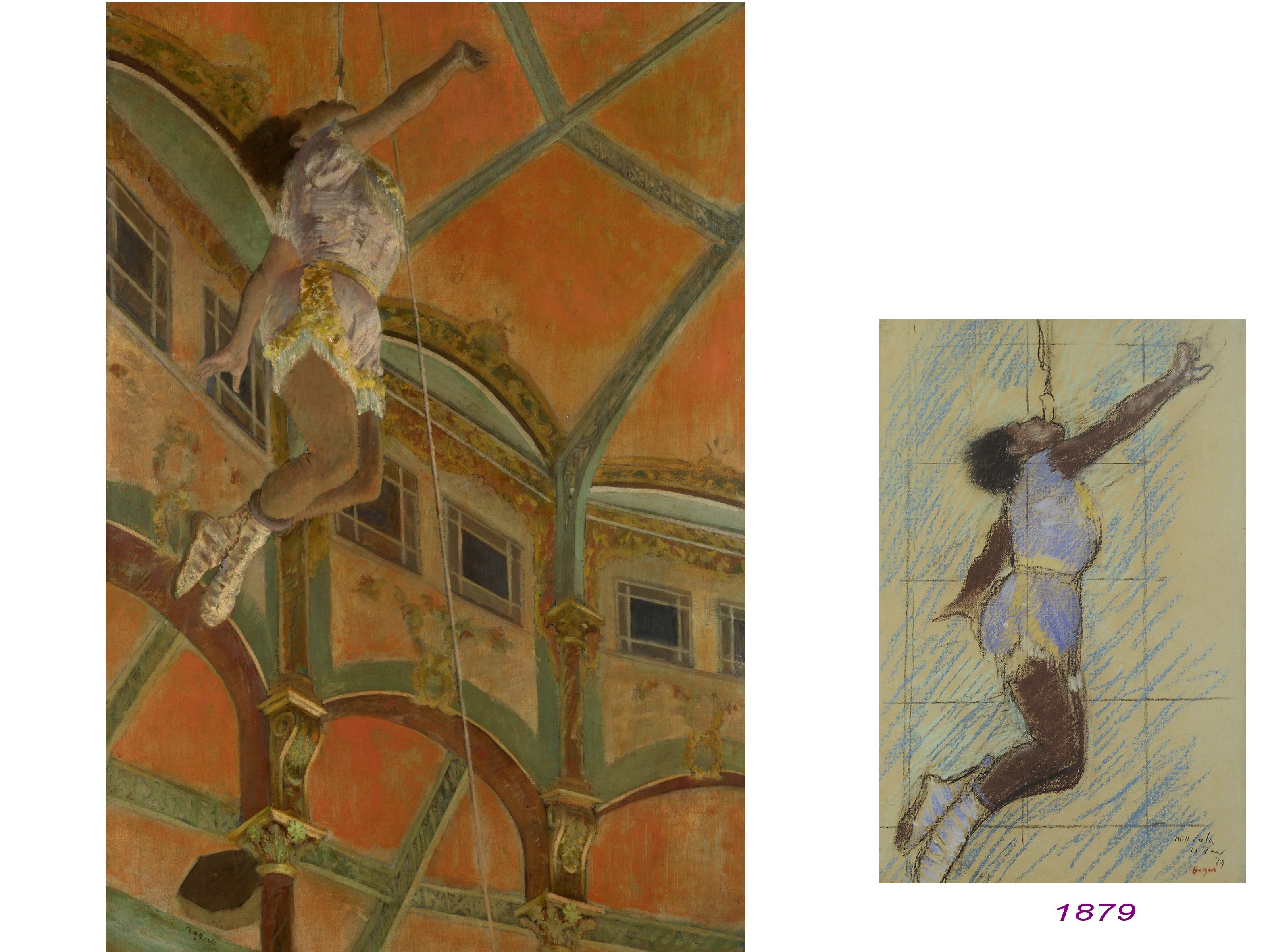 La recherche de points de vue décalés amène Degas, non seulement à l’Opéra, mais aussi au cirque, autre espace dédié au mouvement et à la lutte contre la pesanteur et l’esprit de gravité ( dans tous les sens du terme). ici, Mis Lala, que l’on découvre dans les croquis, accrobate de peau noire,( rarement traitée en peinture).Décentrement, envol, contre-plongée et défi au sol. Ce sont des constantes, comme si Degas s’était construit des règles d’un jeu esthétique.