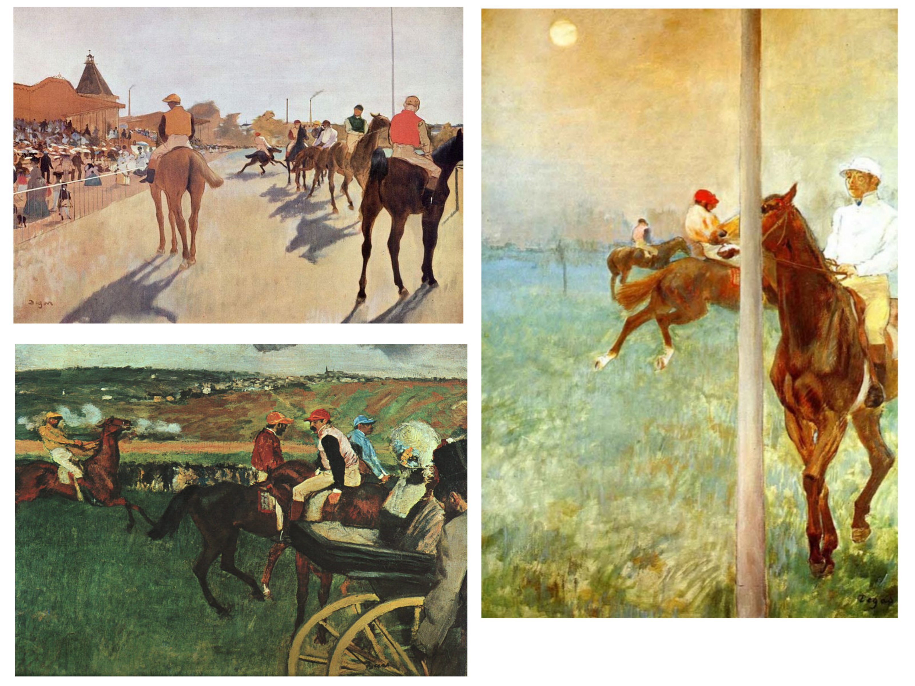 Autre thème cher à l’artiste, les courses de chevaux, la encore, mouvement, déplacements, corps et anatomies dédiés à la vivacité. Les cadrages et prises de vues furtives sont certainement renforcées par l’invention récente de la photographie, technique pratiquée et expérimentée par Degas d’aileurs.