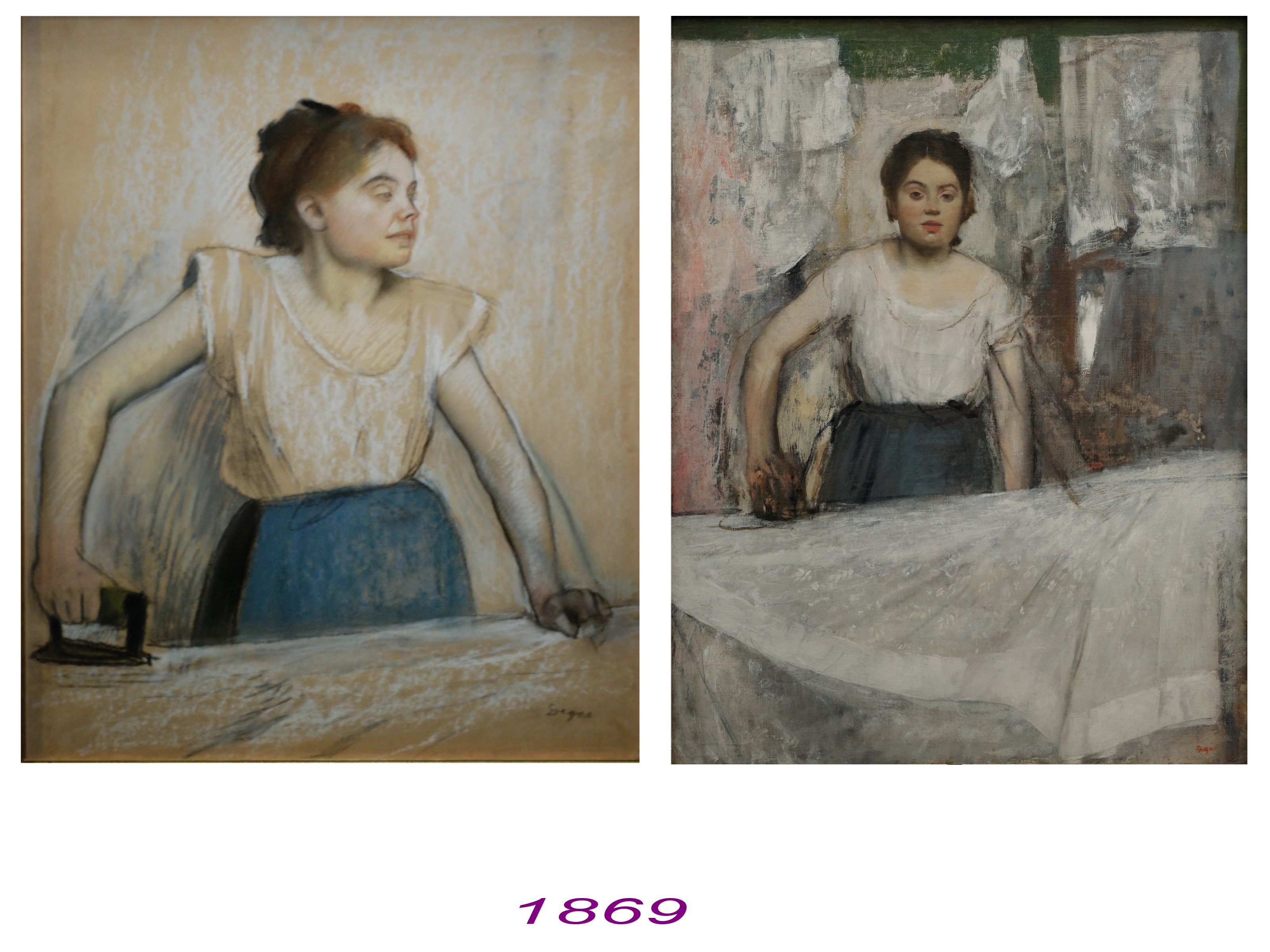 Mais DEgas est aussi l’artiste qui innove dans la représentation de corps féminins. Si les danseuses, correspondent à des canons esthétiques classiques et du monde du spectacle de distinction, il les représente souvent dans des attitudesnaturelles. le regard qu’il porte sur des travailleurse, est le regard d’un peintre en quête de vérité des postures et des corps, éloignés des corps et des poses académiques stéréotypées. Les surfaces blanches et immaculées sont des équivalents plastiques des parquets de l’Opéra.