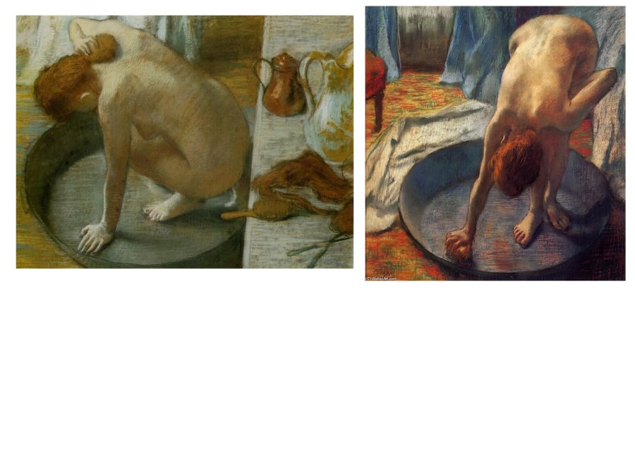 Ce sont ces mêmes corps, plus naturels, de femmes plus âgées et dans des attitudes non étudiées que recherche aussi l’artisyte dans les très npùbrueses peintures de femmes au bain. Les formes géométriques des étagères et les grandes courbes des « tubs », structurent le plan de la toile. La vue plongenate efface la perspective au bénéfice d’arabesques relevées par des modelés remarquablement subtils des grandes surfaces de peau, comme celles du dos.