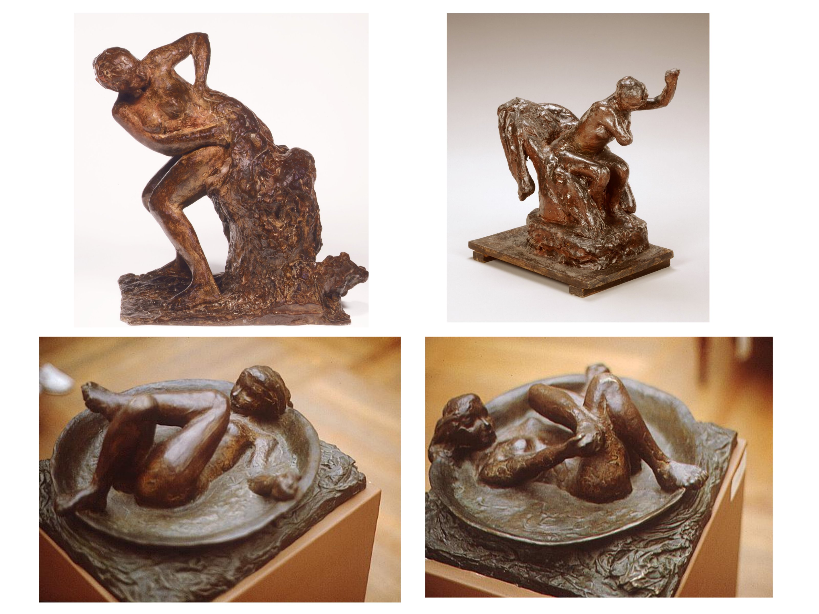 Ces sculptures sont éloignées du lyrisme sensuel de Rodin, mais expriment une grande liberté dans la facture, sans doute générée par le fait qu’elle sont plus considérées comme des études, des recherches. mais l’utilisation d’un « tub » comme socle et dispositif de mise en scène de corps allongés est stupéfiante d’audace, comme celle de sculpter de l’eau.La fluidité de l’instant et des éléments, figée par la terre et le bronze comme par la photographie.