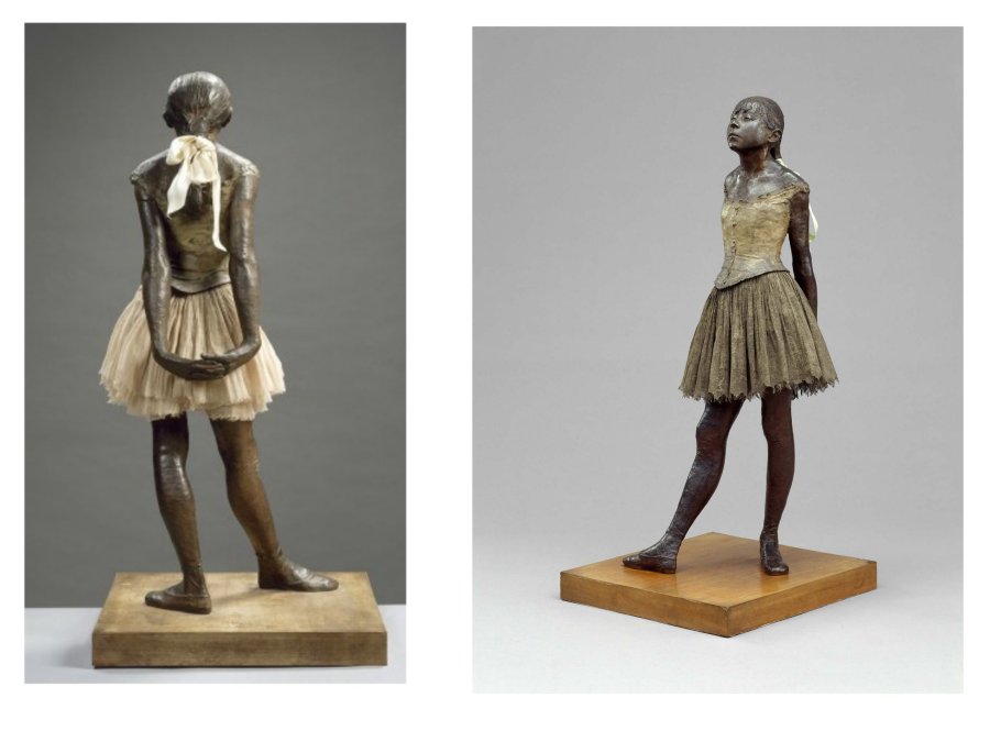 Autre audace et expérience stiupéfiante, celle de vêtir d’un réel justaucorps et tutu, vcette petite danseuse, qui par cet effet de réel en deveint plus troublante, de tension et de grâce, concentrée et tendue, mais sereine et comme inspirée .Sculpture à l’échelle « 1 », elle s’écarte en fait de sexpériences de Degas sur le mouvement, car elle est en repos.