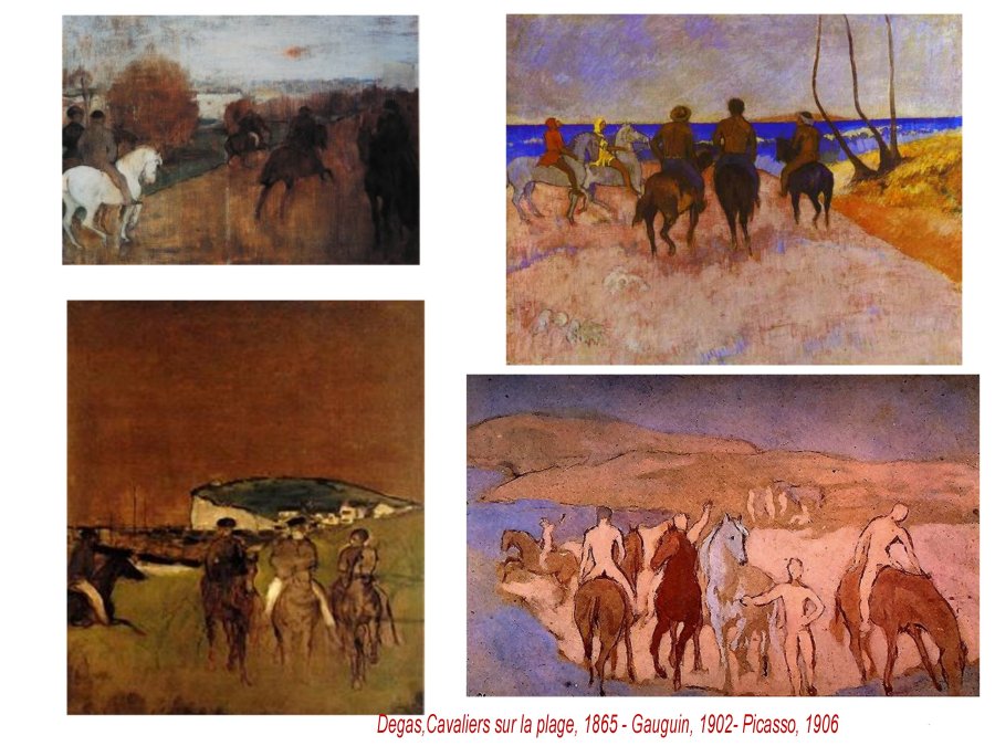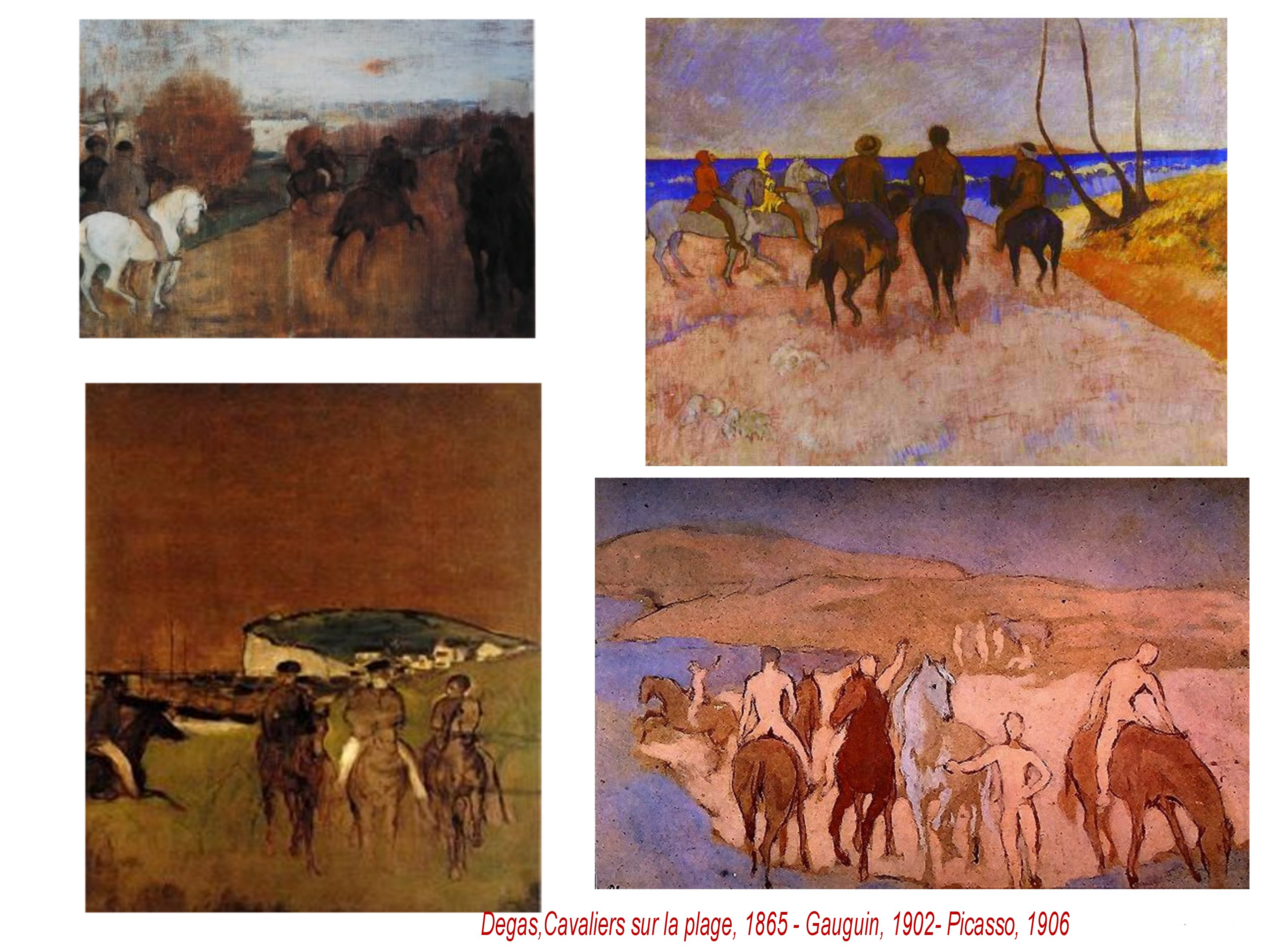 Il est impressionnant de comparer ces peintures..Degas exprime un rapport aux corps et à l’animalité et dégage des valeurs d’harmonie et de communion avec une nature première et positive. Gauguin puis Picasso ont-ils connnu ces oeuvres de Degas où leurs oeuvres résultent-elles de démarches cohérentes et de quêtes de renouveau culturel ? Cohérence des couleurs et du thème. Degas a peu exploré le paysage mais ne recherche jamais le spectaculaire, ni la narration. Une certaine banalité subtile.