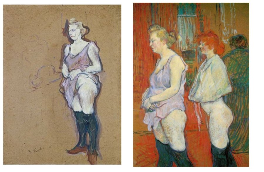 La crudité des figures et des thèmes est transfigurée par des porttraits d’une grande humanité et des couleurs d’une force irrationnelle. Si les postures sont humiliantes, celle d’une visite médicale de prostituées, les regards sont mélancoliques et profonds. Lautrec, comme Degas d’une certaine manière explore différents modèles de corps féminins et interroge les stéréotypes esthétiques.