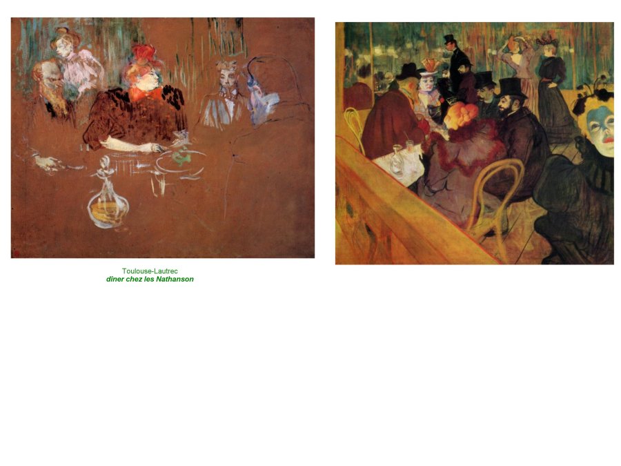 Ces vues semblent décalées, décentrées, se focalisant comme au hasard sur certains points fixes et détails, dans des lumières crues et couleurs saturées. Onne eut s’empêcher de voir ces scènes comme vues par un esprit embrumé et rendu hypersensible, tel que l’alcool pouvait troubler celui de Lautrec, mort à37 ans de délirium tremens. Il subsiste des fulgurances colorées, des visions virtuoses sombrant dans la confusion et le relâchement, l’épuisement.