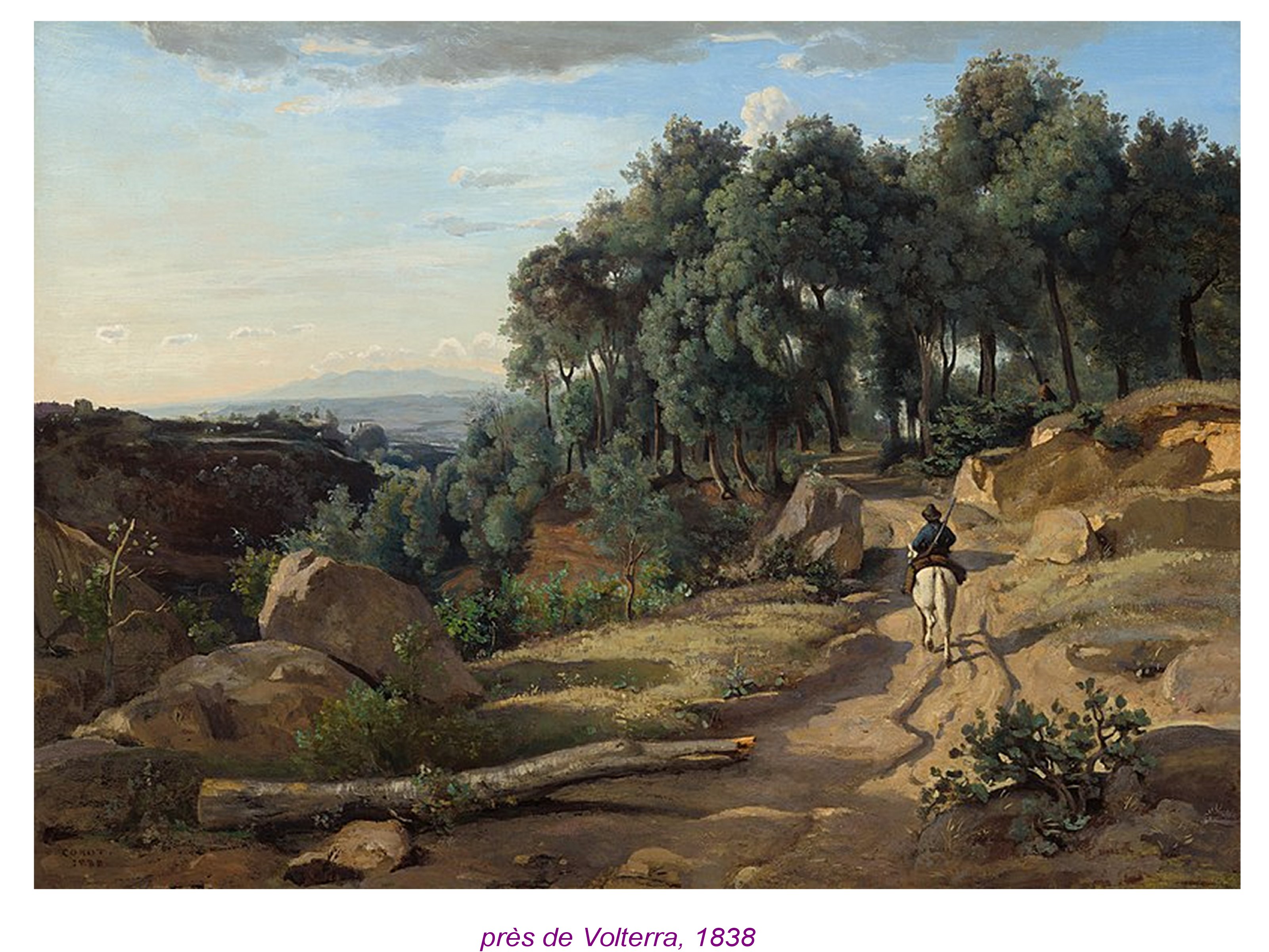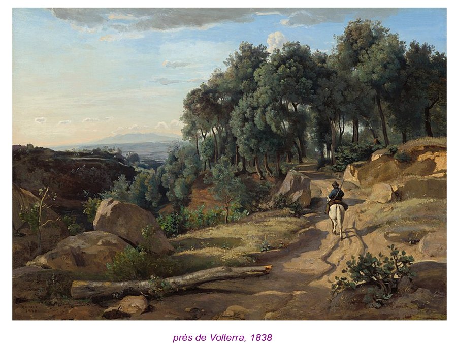 Corot inaugure vraiment un certain art du paysage, comme si il npus proposait des détours, en marge des grandes machines romantiques et historiques du 19e s!ècle. or ces détours, prennent souvent l’aspect de chemins. Bien avant le macadam, ces chemine de terre sont comme des invitations.