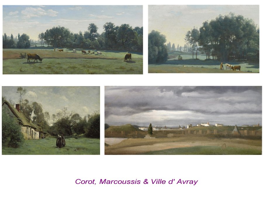 Encore Marcoussis et ville d’ Avray. Les pâturages et la tranquillité harmonieuse des champs cultivés est égale aux paysages naturels . L’absence de contrastes forts, renforce cette vision paisible. Un travail subtil sur la mono-tonie, au sens strict des verts/gris/bruns.