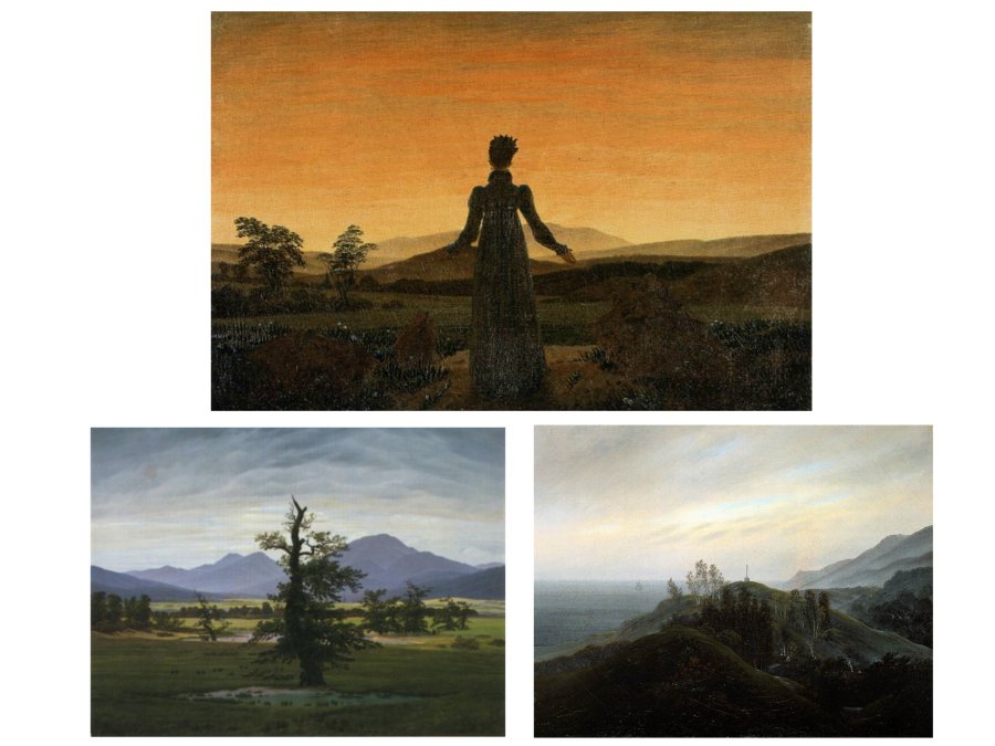 La différence est grande avec Caspar David Friedrich, qui dans ses contemplations, exalte une dimension métaphysique de la nature, des infinis et des lointains. Lumières fléchissantes, Frontières et espaces infranchissables. Peinture lisse et maîtrisée.