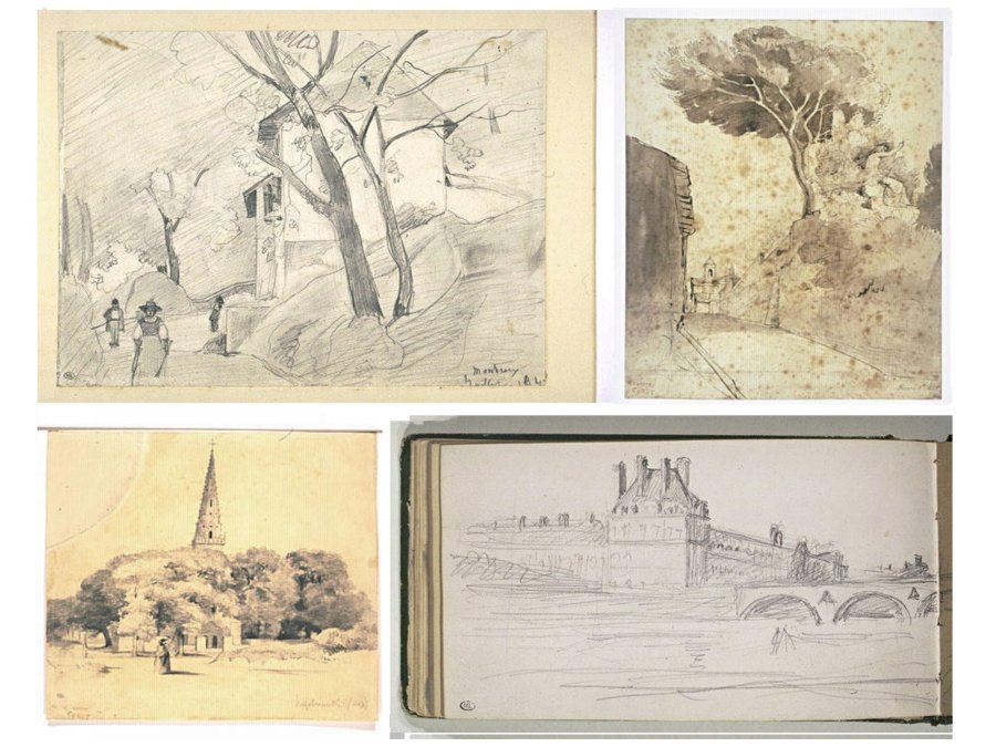 Les réserves de dessin du Louvre abritent des centaines de croquis de Corot. Ces carnets sont le témoignage le plus éclairant sur sa pratique vive, sa vision synthétique, de masses et de grandes lignes qui constituent un « paysage ».