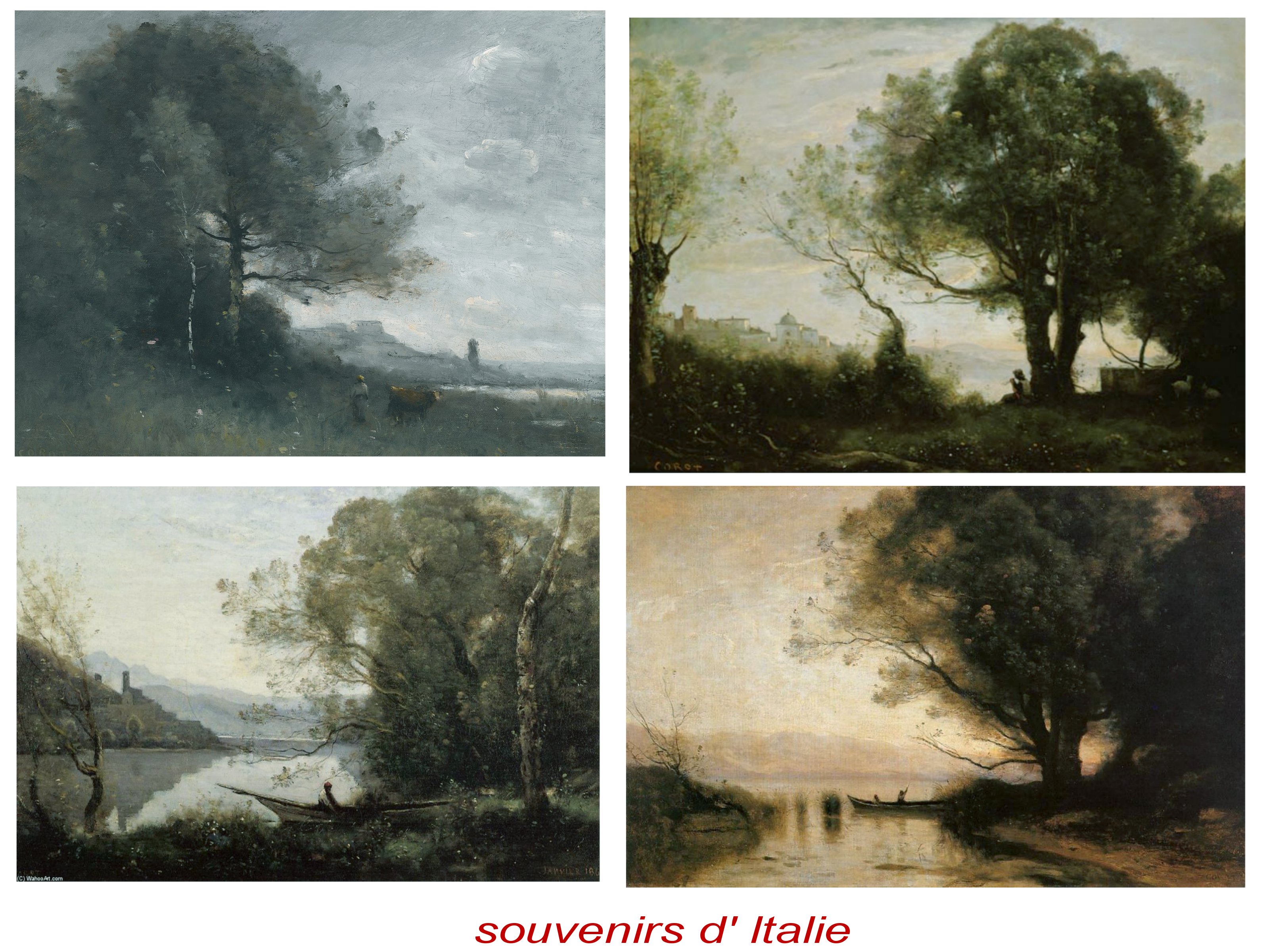 Ces souvenirs d’ Italie sont bien filtrés par des lumières françaises des pays d’Ile de France, chers à Corot, Marcoussis, Mantes, Ville d’ Avray. Comme une Italie inaccessible. Plus que paysages italiens, ce serait l’harmonie de cette nature qui pourrait générer des réminicences d’autre moments harmonieux. Corot ne table jamais sur l’anecdote.