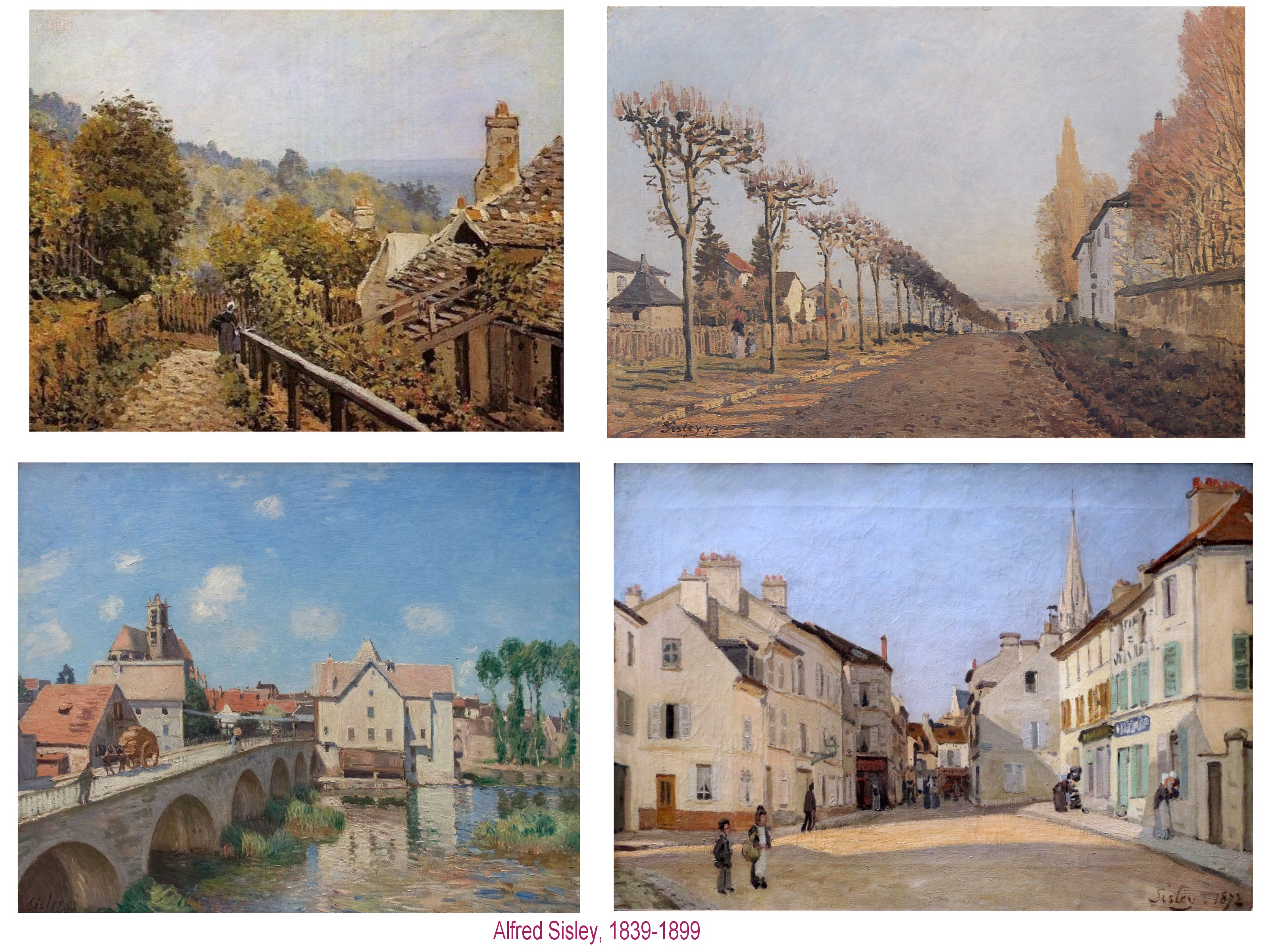 Plus jeune, mais de sensibilité proche, Alfred Sislay, sera sans doute celui des impressionistes, qui établira au plus près le lien avec le legs de Corot. Notamment par son intérêt répéta pour les chemins et les rives du Loing et de la Seine, à Moret/Loing paticulièrement.