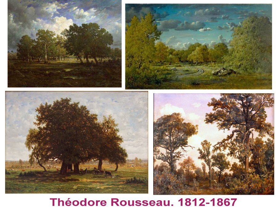 A Barbizon, d’autres artistes, bien différents, commencent à observer les landes et arbres avec une diversité remarquable, comme Rousseau, qui scrute les infimes varaiations des ramures et canopées. Sans aucune tendance à la séduction.
