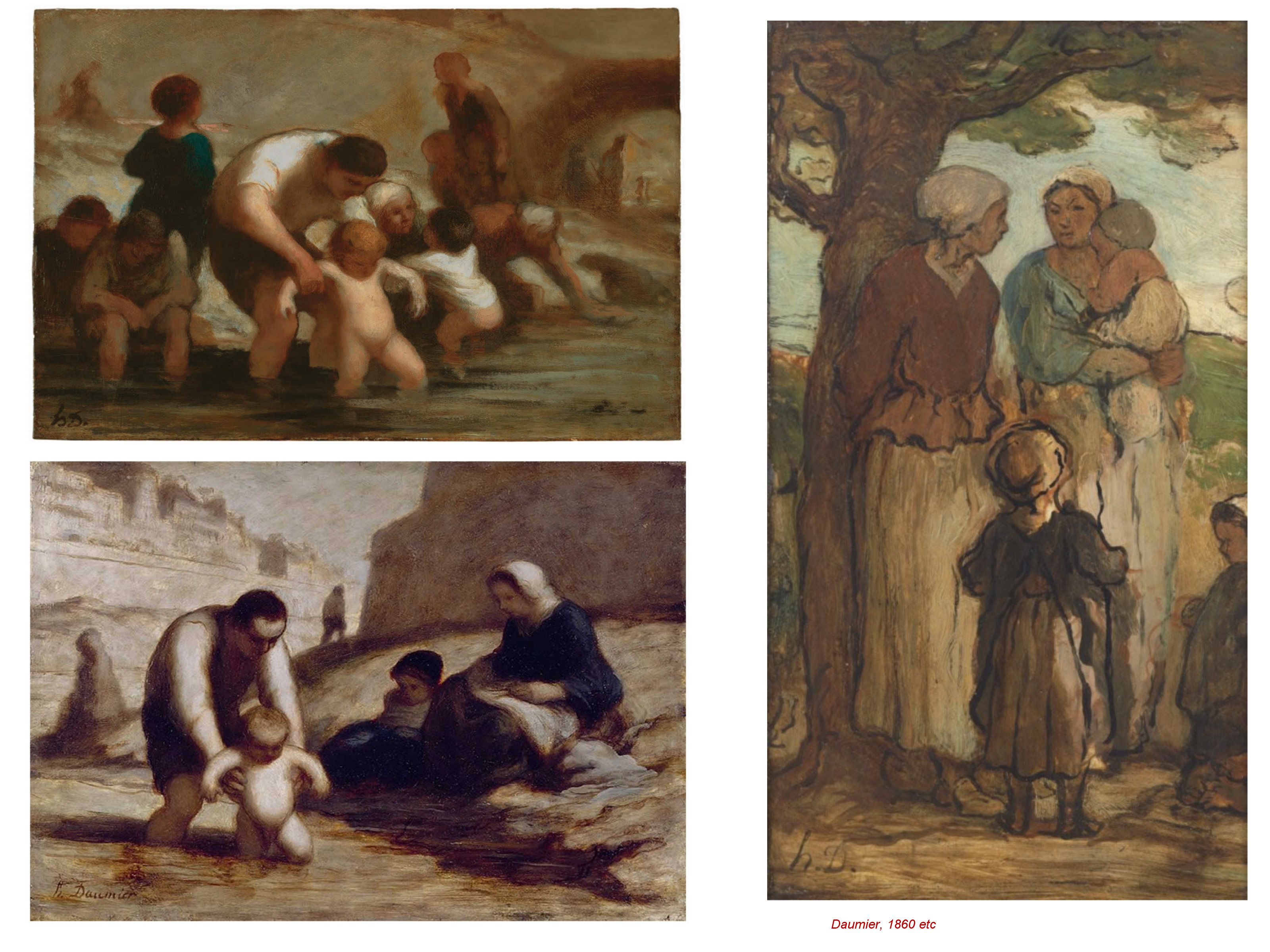 Daumier et Millet, furent des amis proches de Corot, qui ira même jusqu’à les aider financièrement. La complicité de Corot avec Millet et Daumier repose sur leur même regard se détournant du spectacle et de l’apparat clinquant des salons de ce siècle en ébullition. Daumier, caricaturiste, est aussi un observateur sensible des scènes populaires et des corps anonymes mais heureux du peuple .
