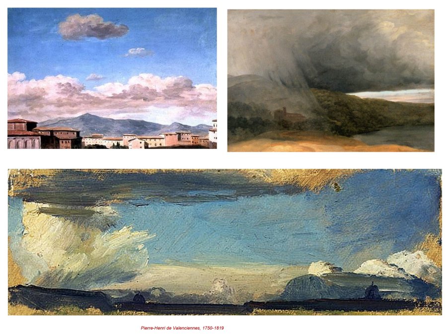 Parmi les plus étonnants précurseurs discrets de Corot, on peu compter Pierre Henri de Valenciennes, qui dès le début du 19e siècle fait des peintures/érudes de cieux. Comme un non-sujet, mais qui suffirait. Portant délibérément le regard vers les hauteurs.