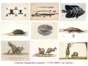 - Lesueur observe et note tous les êtres vivants , essentiellement ceux qui représentent de scaractères nouveaux. mais sans exotisme spectaculaire, avec une rigueur scientifique. Il n’y a pas réllement de dissociation entre les croquis d’artistes et les figurations à destination scientique ; de cette ambigüité naissent ces planches élégantes et ces représentaions vivantes.