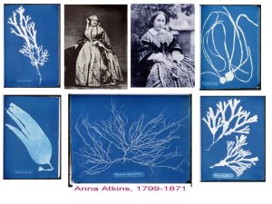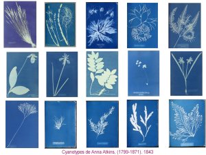 - Anne ATkins, légèrement plus âgée est celle qui a inventé avec ses cyanotypes, l’utilisation de la photographie et de sortes de planches contact, permettant d’enregistrer les silhouettes de plantes et algues. Les dispositions, répondant à des nécessités didactiques et scientifiques, sont tout de même organisées avec grâce et la couleur bleue donne une dimension sérielle artistique à ce catalogue.