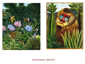 - la vision du douanier Rousseau est certes bien différentes, non scientifique, mais nourries justement de la diffusion de plus en plus populaire de ces végataux et animaux merveilleux des mondes lointains. L’idée commune cependant d’un monde originel, paradis et Eden, comme antidote à l’industrialisation brutaliste de la fin du 19e siècle. cette « naïveté » de Rousseau est souvent associée justement au « primitivisme » des peuples Indiens, et à l’irrationalité féminine, théorie nauséabonde et répandue.