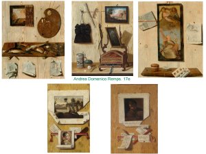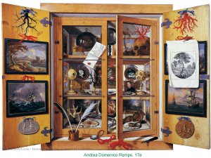 - L’une des plus extraordinaires peintures de cabinet de curiosité est ce trompe-l’oeil en vitrine de Domenico Remps. Un véritable decriptif exhaustif de toutes les figures existant au monde et de la diversité de leur représentations possibles.