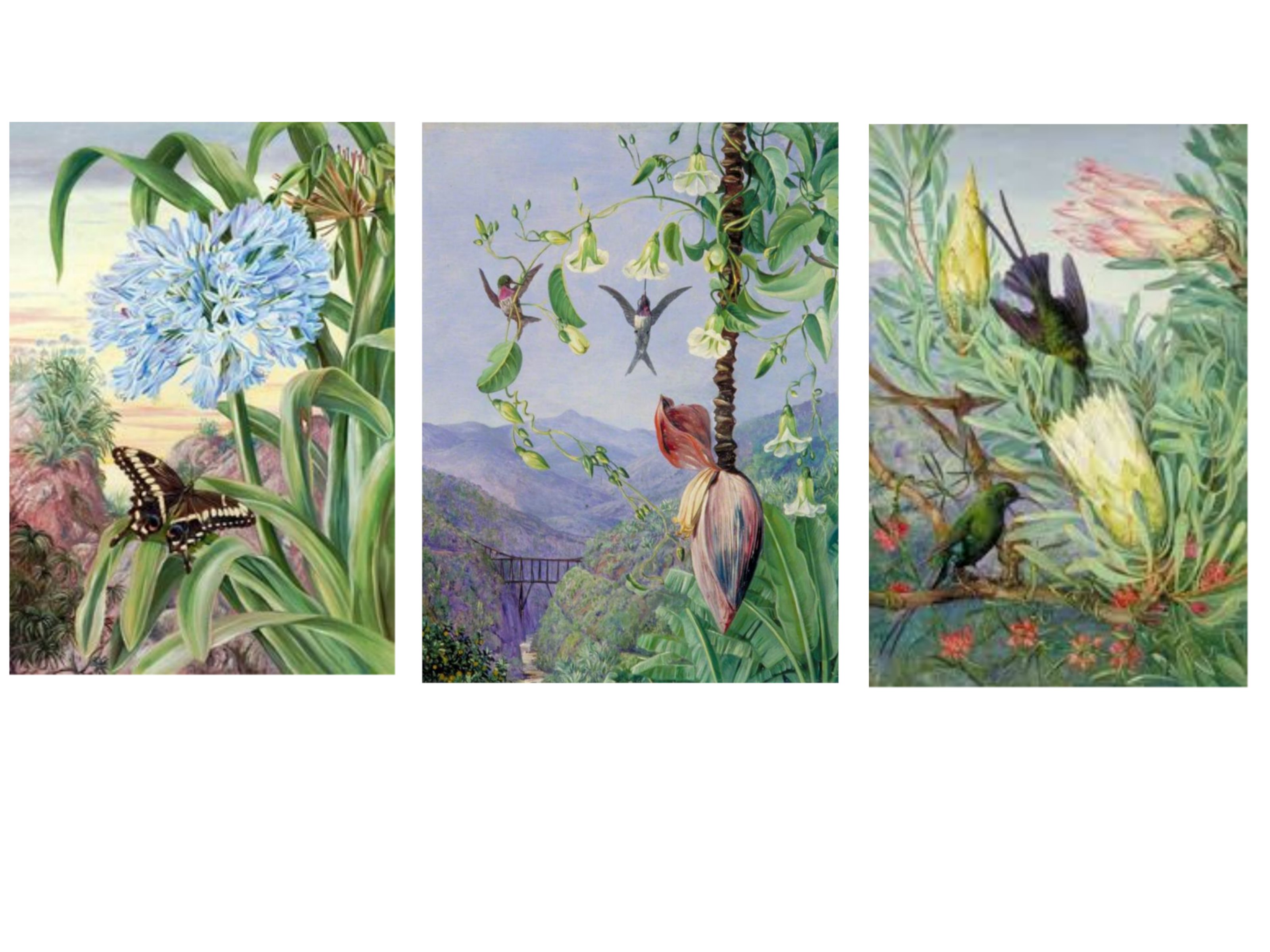 la délicatesse des tons révèle la diversité du monde. On voit aussi , dans ces 3 peintures, l’intérêt naturel pour la faune vivant en symbiose avec les plantes. Ici, l’espace dégagé est immense, équilibré par un premier plan savamment composé, utilisant le vol des oiseaux et/ou papillons pour occuper l’espace.