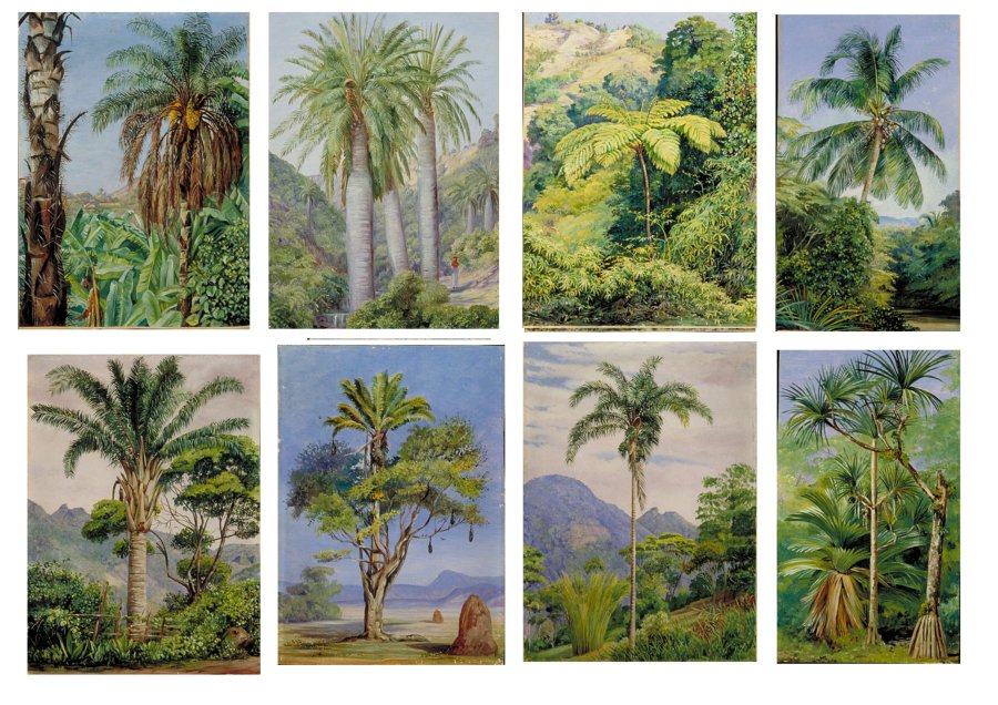 Si elle pose son regard sur les plantes de taille modeste, Marianne North nous propose aussi une galerie de portraits d’arbres ; comme un catalogue des variations possibles.