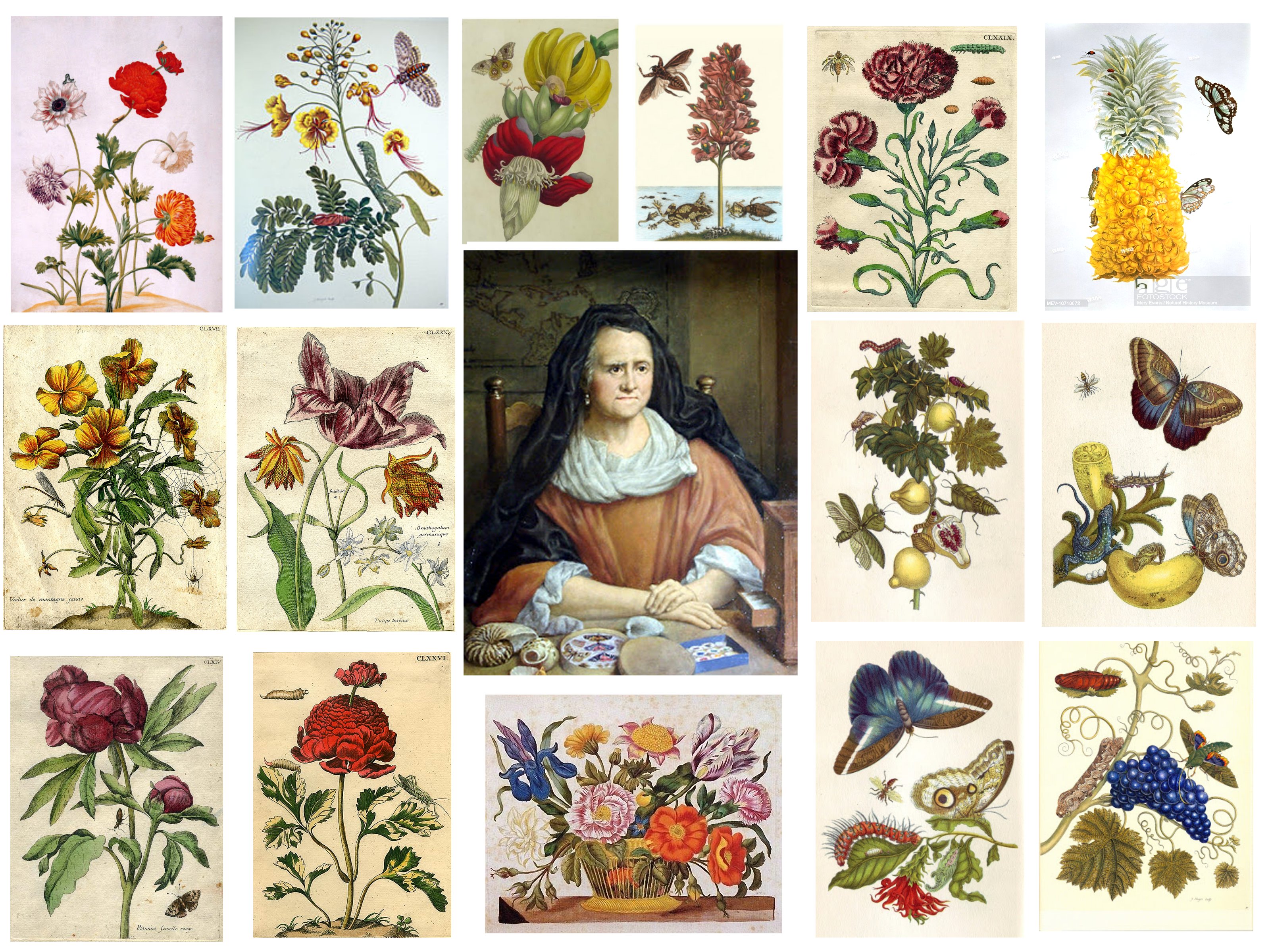 Son travail est plus graphique que celui de North, qui est clairement pictural ; vraisemblablemnt aussi car il est destiné à la reproduction gravée. On admire à ce propos, la grande finesse des modelés et des couleurs restituées avec cette technique ( gravure+ pochoirs vraisemblablement). Maria Merian joue aussi clairement des ondulations naturelles des tiges et feuilles pour organiser ses planches.