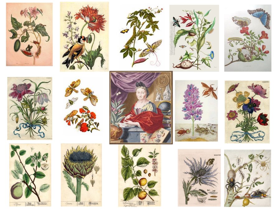Maria Anna Sybilla Merian, est aussi une entomologiste et elle associe systématiquement palnts et animaux. A la différence ( grande) de M. North, les éléments sont décontextés, ce qui oriente ces travaux vers l’illustration scientifique plus que la nature morte ou le paysage.