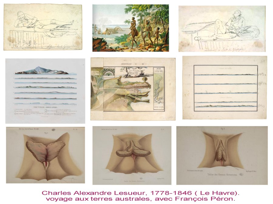 Lesueur note aussi les comportements et particularisme des peuples rencontrés. Jusque dans l’intimité. Il note aussi, et celà est nouveau, des postures etattitudes qui évoquent aussi la lanheur de ces longs voyages du temps de la marine à voile. Ses relevés de côtes sont aussi d’une grande finesse et précision et évoquentl’approche lente et progressive des navires en vue de la terre, signalée par les vigies.