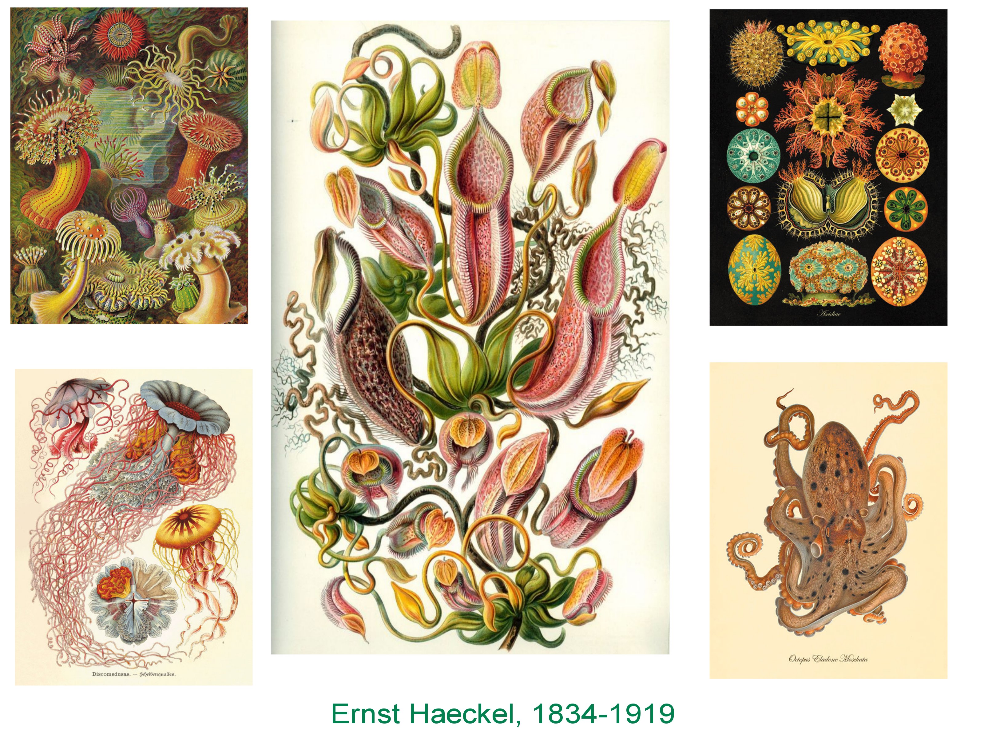 Haeckel est aussi fascné par l’ordre des choses et les synmétries, les rythmes, les structures. L’ordonnancement de ses gravures cherche clairement à exprimer un ordre dans l’infinie diversité des formes naturelles.