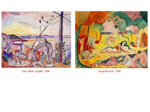 Ces 2 versions successives du « luxe », éclairent bien la quête de Matisse, vers l’éte,due et l’épure. Simplifier les formes et les adapter en douceur au format, quitte à déformer légèrement les anatomies. Admirant Ingres en celà. AUtre aspect, c’est l’élimonation méticuleuse de tous les dégradés comme signes du relief et de la profondeur, au bénéfice de grans aplats de couleurs soigneusement sélectionnées. Le sujet est encore marqué par la quête d’harmonie de l’humanité dans une nature bienveillante. Matisse étend aussi la surface de ses toiles, qui deviennent très grande, afin de proposer un espace réel et non plus virtuel. Une surface de lumières.