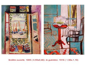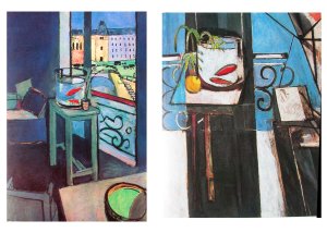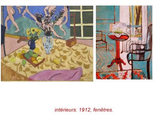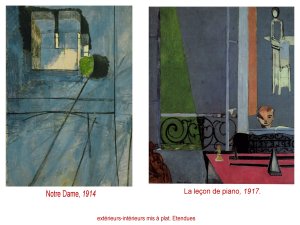 Dans ces 2 oeuvres, nous retrouvons un coin d’atelier ou à chaque fois, Matisse propose les différents aspects du réel. l’intérieur à gauche, rassurant et apaisant. l’angle de la pièce séparant les fauteuils et canapés, ou encore chevalets et peinture, de la droite, lien avec le monde extérieur, de la fen^tre et aussi du regard de l’artiste, qui comme vide, ici, se fait le simple vecteur de la transfromation vers l’épure..