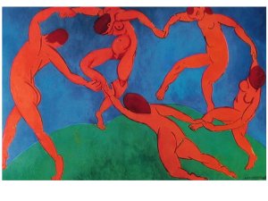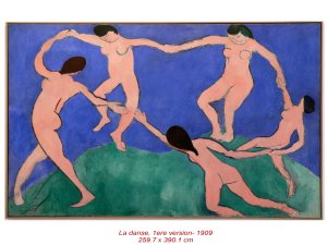 La commande de Chtchoukine pour la Danse, est un echo parfait à ses préoccupations. La danse, comme la musique étant des pratiques cathartiques, tendant à s’élever du sol et à conjurer la condition humaine du labeur et de la pesanteur. Motif de la ronde déjà présent dans sa peinture La joie de vicre, il la reprend, en dissociant progressivement une grande figure debout à gauche. Proche aussi de sa 2eme version du Luxe, par les déformations légères de l’anatomie et l’espace traduit par des grandes zones colorées.