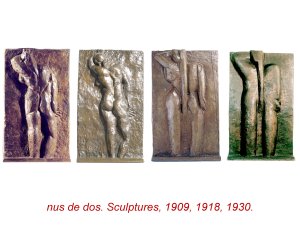 Si l’on rapproche les 4nus bleus des 4 silhouettes sculptées, nous avons comme un raccourci de la démarche de matisse, qui est d’alléger les corps, de leur faire quitter leur destin de chairs pesantes et souffrantes pour aller vers une sérénité océanique.